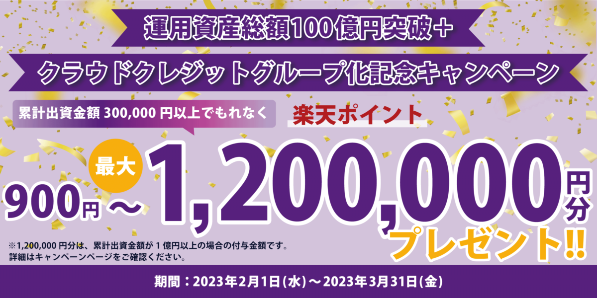 なお、2023年1月のクラウドクレジットグループ化記念および今回の運用資産総額100億円突破を記念して、2023年2月1日(水)から2023年3月31日(金)までの期間中、「運用資産総額100億円突破+クラウドクレジットグループ化記念キャンペーン」を実施いたします。