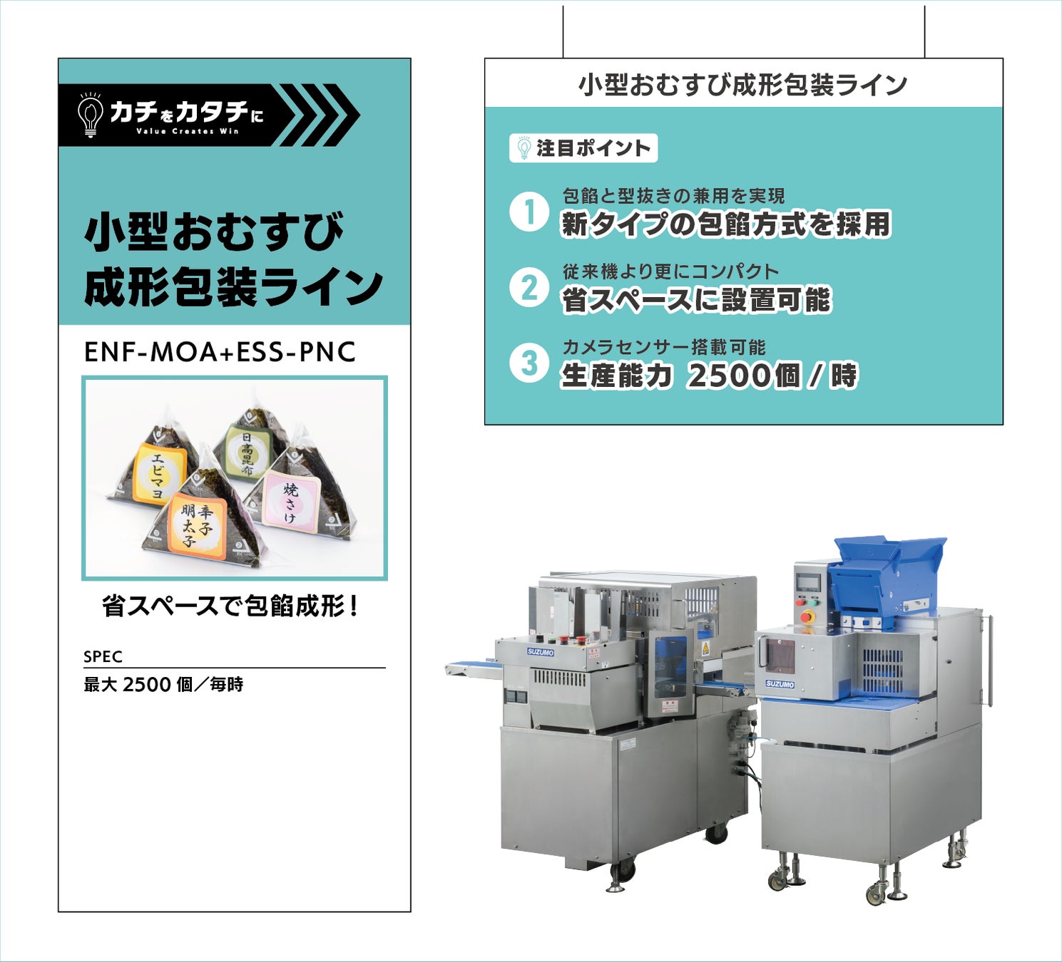 弁当容器飯盛ライン、計量器付ご飯盛り付け機ン、おむすび成形包装ライン、いなり揚げ供給機、いなり寿司ロボット など!多数展示