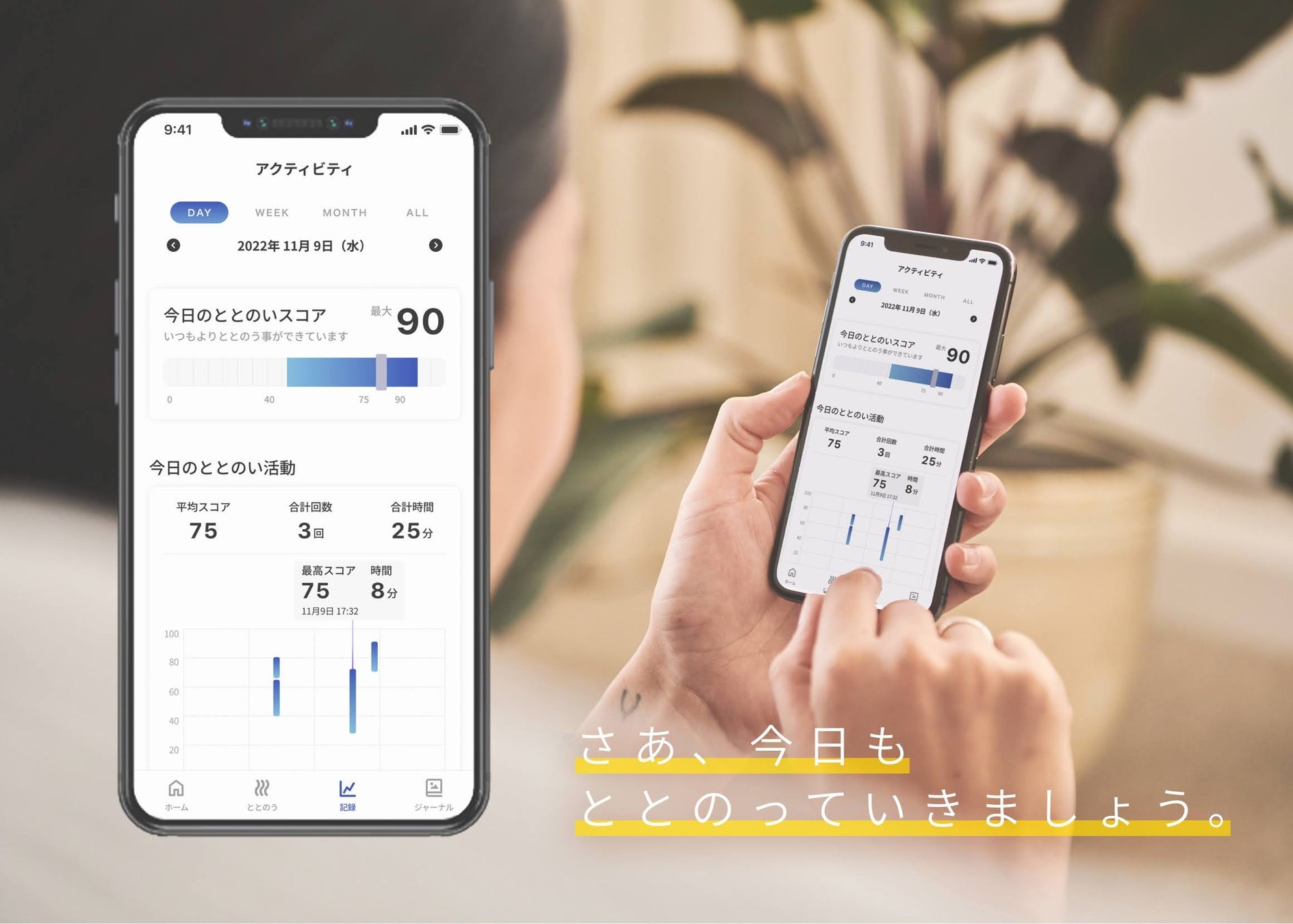 専用アプリで、あなたの「ととのい」活動を記録。シーンや時間、出来事などとともに、あなたの「ととのい」活動を記録することができます。