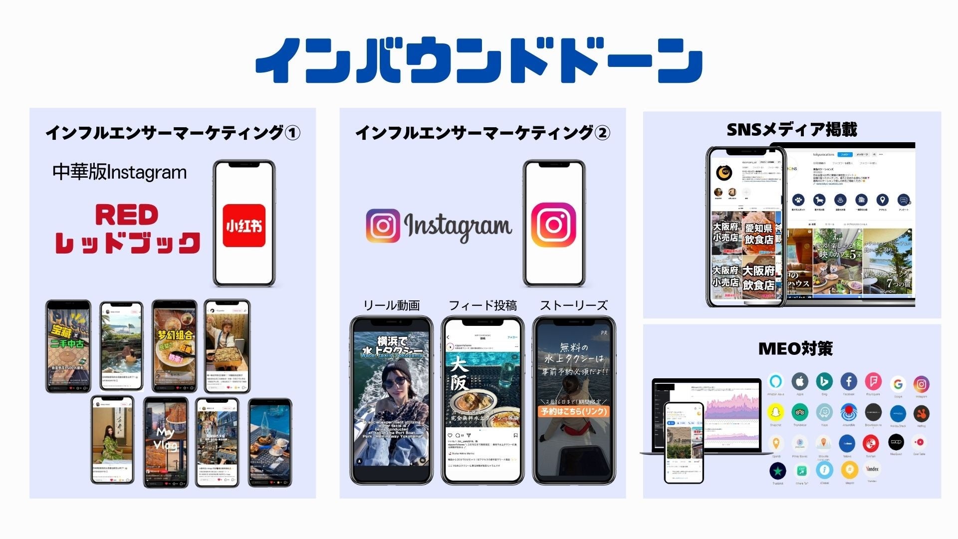「インバウンドドーン」は、急増する訪日外国人観光客に対し、中国を中心とする中華圏(中国本土・香港・台湾)向けには「小紅書(レッドブック)」、その他のエリア(日本国内・欧米諸国等)向けには「Instagram」を活用したインフルエンサーマーケティングを軸に、多言語対応・SNS施策・MEO対策までをトータルで支援する、新たなインバウンド対応ソリューションです。