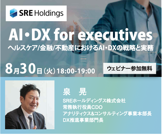 不動産/金融など、多様な産業にAIソリューション・ツールを提供するSREホールディングス株式会社(本社:東京都港区、代表取締役社長:西山 和良)は、8月30日(火) 18:00より「AI・DX for executives ヘルスケア/金融/不動産におけるAI・DXの戦略と実務」と題したウェビナーを開催いたします。