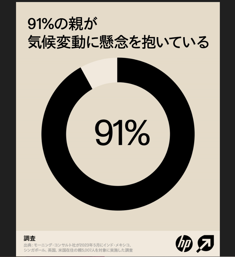 インド、メキシコ、シンガポール、英国、米国の親を対象に行った調査(英語PDF)( https://press.hp.com/content/dam/sites/garage-press/press/press-kits/2023/2022-sustainable-impact-report/HP%20Sustainable%20Purchasing%20Pulse%202023_Executive%20Summary.pdf )で、91%の親が気候危機に懸念を抱いており、その結果、自身の生活や購買習慣を変えようとしていることが分かりました。半数以上となる53%が、気候変動が、子どもを増やすかどうかについての考えに影響を与えていると答えています。また、回答者のうち43%は企業の環境問題や社会問題への取り組みに基づき、勤務先を再検討したと答えました。