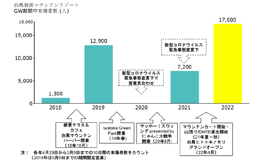 株式会社岩岳リゾート(本社:⻑野県北安曇郡⽩⾺村、代表取締役社⻑:和⽥寛、以下「岩岳リゾート」)が運営する「⽩⾺岩岳マウンテンリゾート」では、2022年4⽉29⽇(金・祝)から5月8日(日)までのゴールデンウィーク(GW)期間中の来場者が、過去最高の17,600人を記録したことをお知らせします。