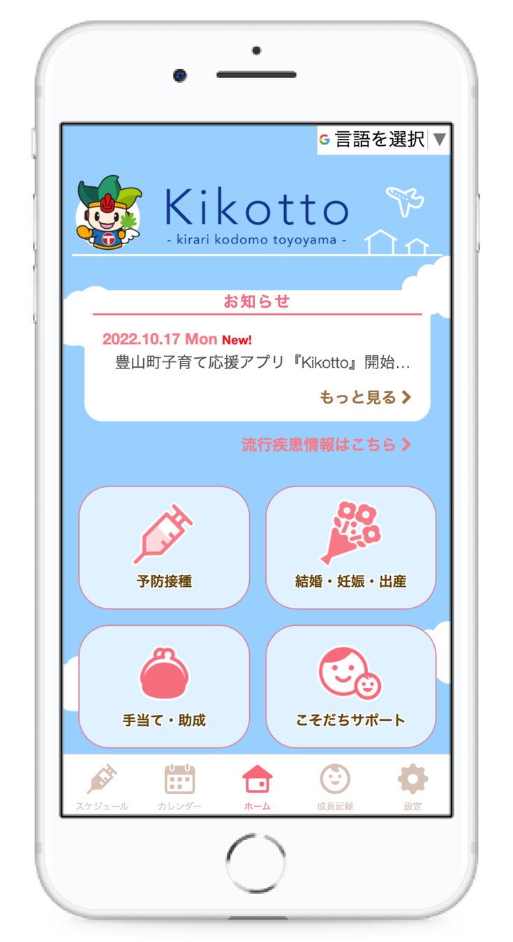 「子どもの、親の、みんなの声を聴こっと」という想いを込めて「豊山町子育て応援アプリ〈 Kikotto 〉」と命名しました。トップページは、空港をイメージした飛行機と青空のイラストを背景に、地域の皆様にも馴染み深い豊山町のマスコット・キャラクター「地空人(ちくうじん)くん」が登場。豊山町らしさが詰まった、こだわりのデザインでお届けします。