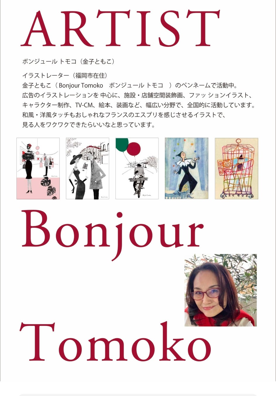 開設を記念する第一回展示として、福岡で活躍する人気のイラストレーター・ボンジュールトモコ氏による企画展を開催いたします。