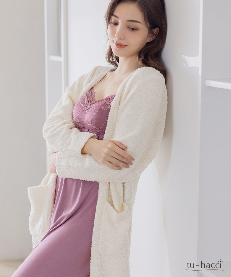 Rakusia Sleepシリーズと相性抜群のもこもこカーディガンは、2タイプから選ぶことができ、寒い夜も温かく、羽織ったまま授乳ができる優れものです。