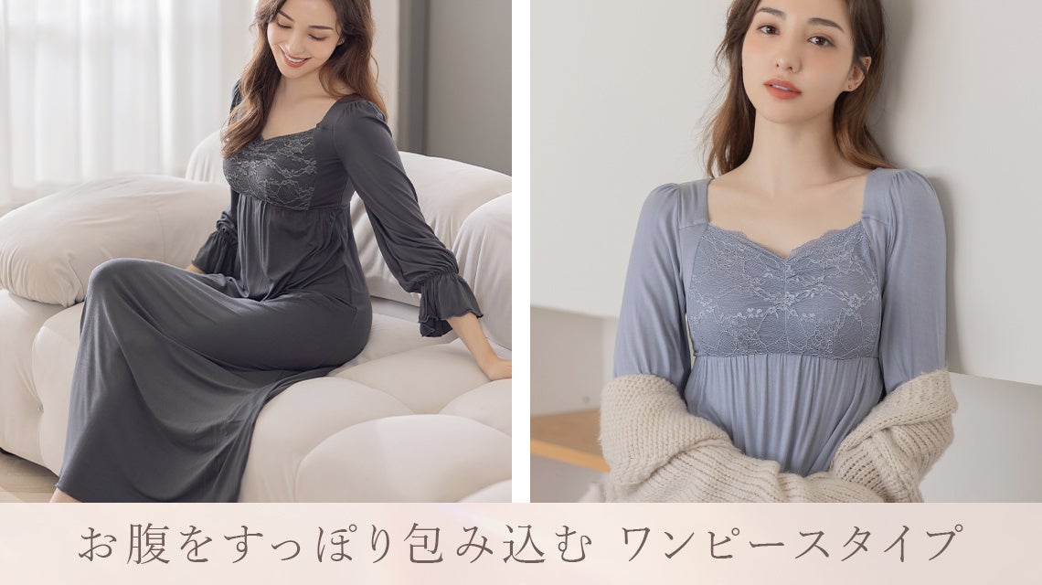 この秋新登場の『ワンピースタイプ』は、ノンワイヤーのナイトブラで徐々に重くなるバストを支えながら、大きくなるお腹を締め付けないよく伸びる生地で、すっぽり包み込んで冷えから守ります。