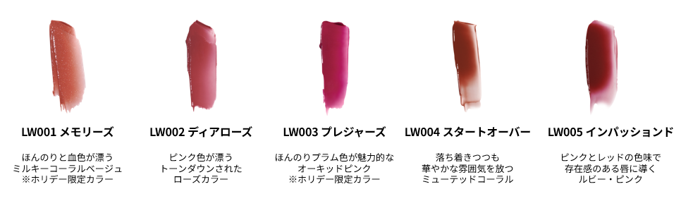 さらに、塗り重ねるほどに光沢感が増す高保湿タイプのリップ「ムードインハンサーリップグロウ」を新開発しました。5色のうち、2色は今しか購入いただけないホリデー限定カラーです。