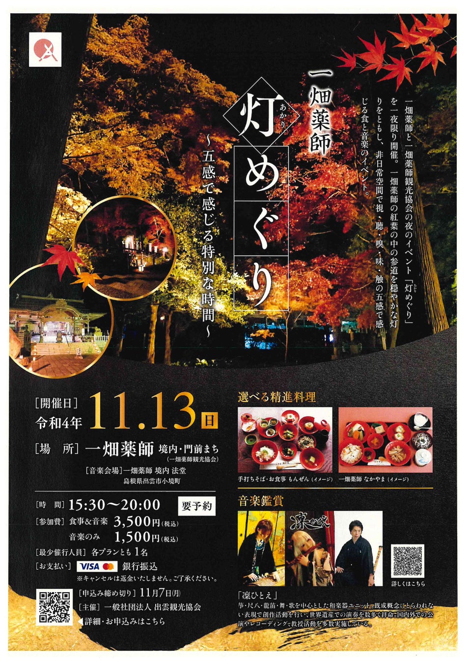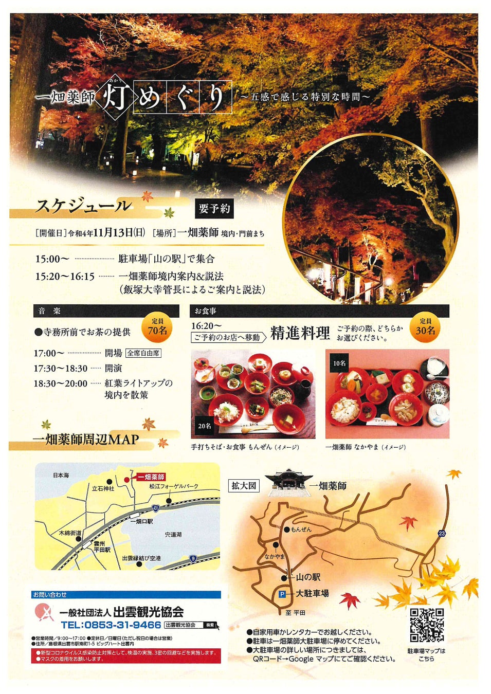 15:00 一畑薬師駐車場集合 15:20 一畑薬師境内案内&説法(飯塚大幸 管長) 16:20 精進料理【定員30名】 17:30 音楽鑑賞(和楽器ユニット「凛ひとえ」【定員70名】 18:30 紅葉ライトアップの境内散策 20:00 終了 |