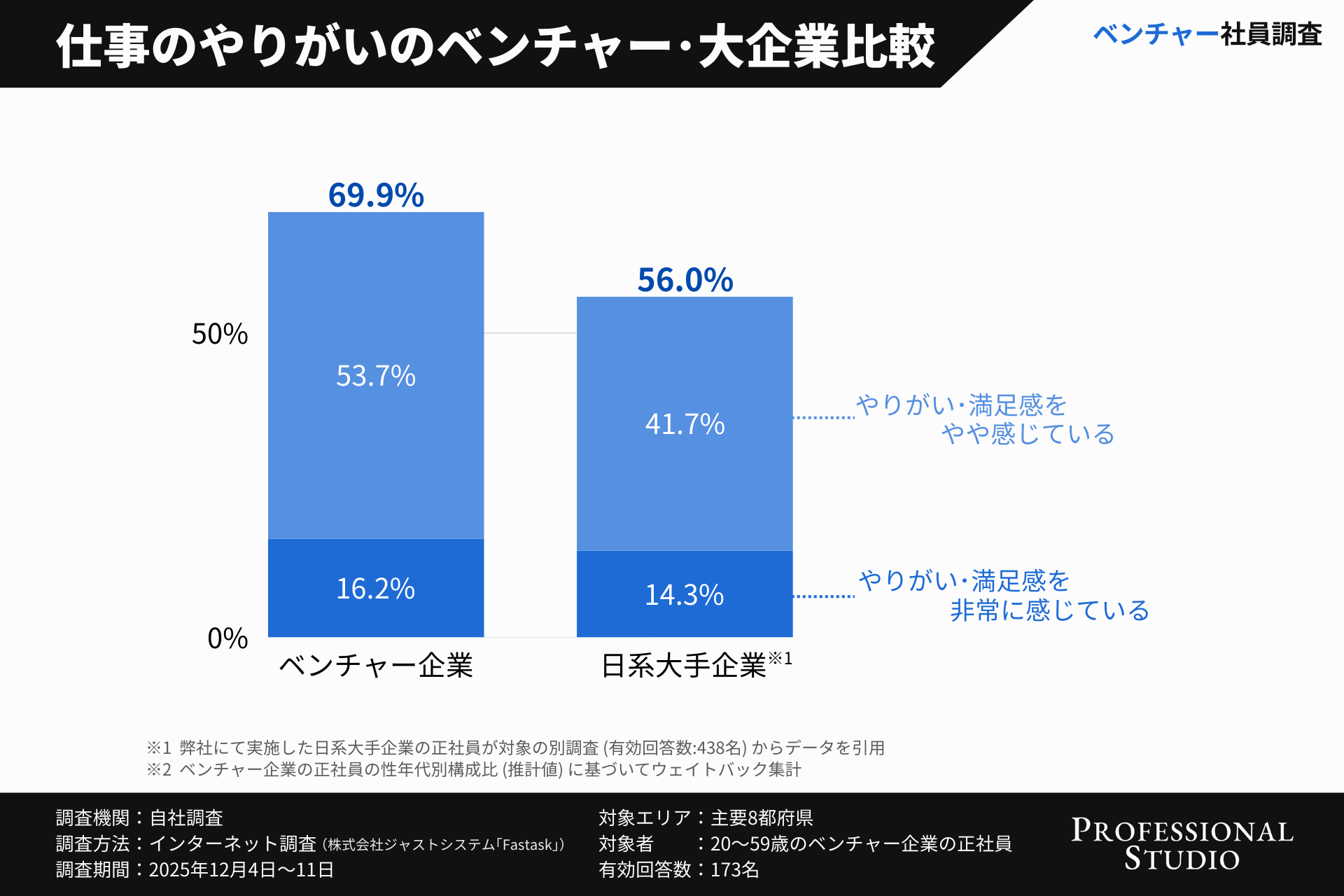 そこで、ベンチャー・中小企業向けのHR総合支援サービスを行うProfessional Studio株式会社( https://professional-studio.co.jp/ )(本社:東京都中央区、代表:市川龍太郎)は、ベンチャー企業における働き方と仕事の満足度との関係性を明らかにするため、主要都府県に在住するベンチャー企業の正社員173名を対象に調査を実施しました。