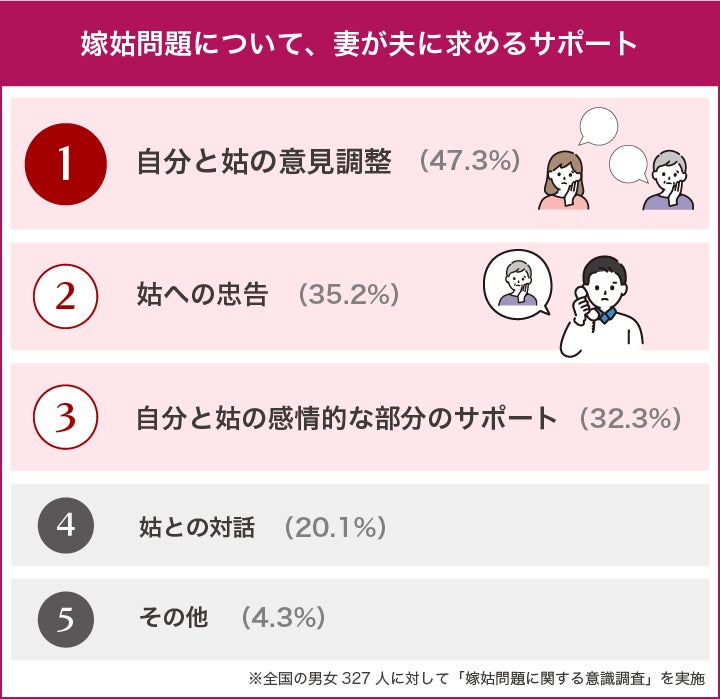 先の質問で、問題解決のために姑と直接対話した妻が2割にとどまっていることからも、「間に入ってほしい」「私の代わりにズバッと言ってほしい」ことを期待していることが分かります。