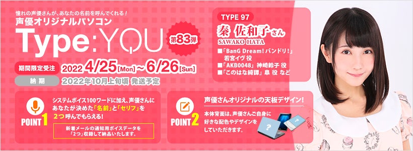 声優オリジナルパソコンに秦佐和子さんが登場!【Type:YOU -タイプユー-】第83弾は4月25日よりスマッシュコアで受注開始!