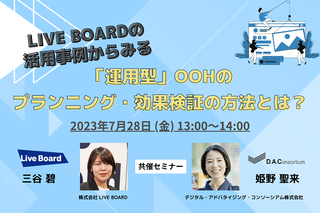 株式会社 LIVE BOARD(本社:東京都渋谷区、代表取締役社長 櫻井 順、以下LIVE BOARD)は、デジタル・アドバタイジング・コンソーシアム株式会社(以下DAC)と共催で2023年7月28日(金)13:00~14:00にて、無料オンラインセミナーを開催します。