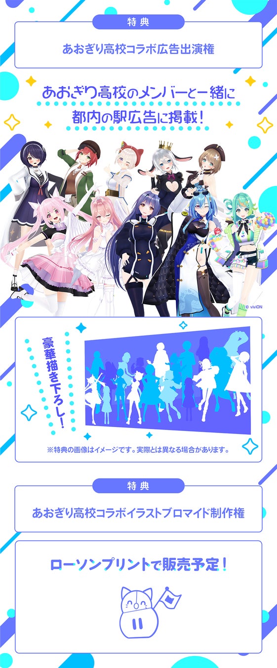 「あおぎり高校コラボ広告に出演しよう!」は、人気VTuberグループ『あおぎり高校』のメンバーたちと一緒に駅広告に載ろう!がコンセプトのイベントです。イベント期間中に獲得したイベントポイントの総数でランキングを決定し、見事入賞を果たしたVtuberやVライバーは特典として、「あおぎり高校コラボ広告出演権」「あおぎり高校コラボイラストブロマイド制作権」を獲得できます。さらに広告は、豪華描き下ろしイラストで制作され、ブロマイドとしてローソンプリントでの販売も行われます。