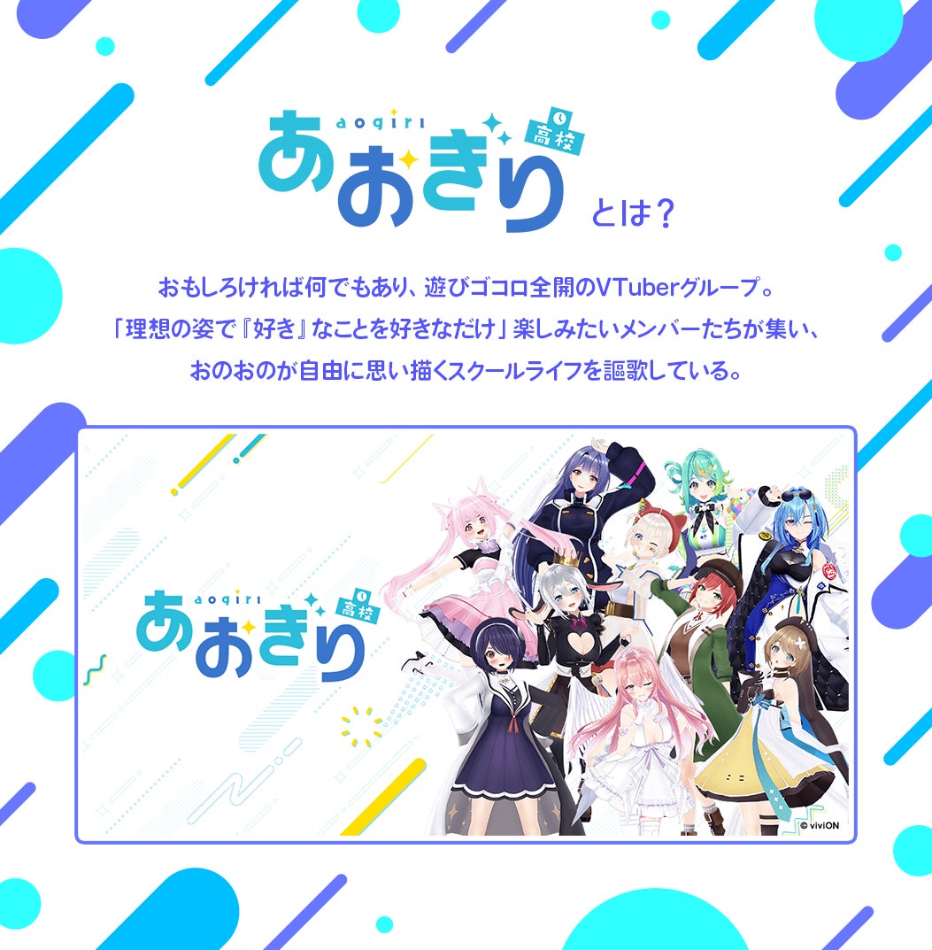 株式会社viviONが運営するVTuberグループです。都内のどこかに存在している『あおぎり高校』には「理想の姿で『好き』なことを好きなだけ」楽しみたいメンバーが集っています。「おもしろければ、何でもあり!」のスタイルでおのおのが思い描く理想のスクールライフを過ごしています。