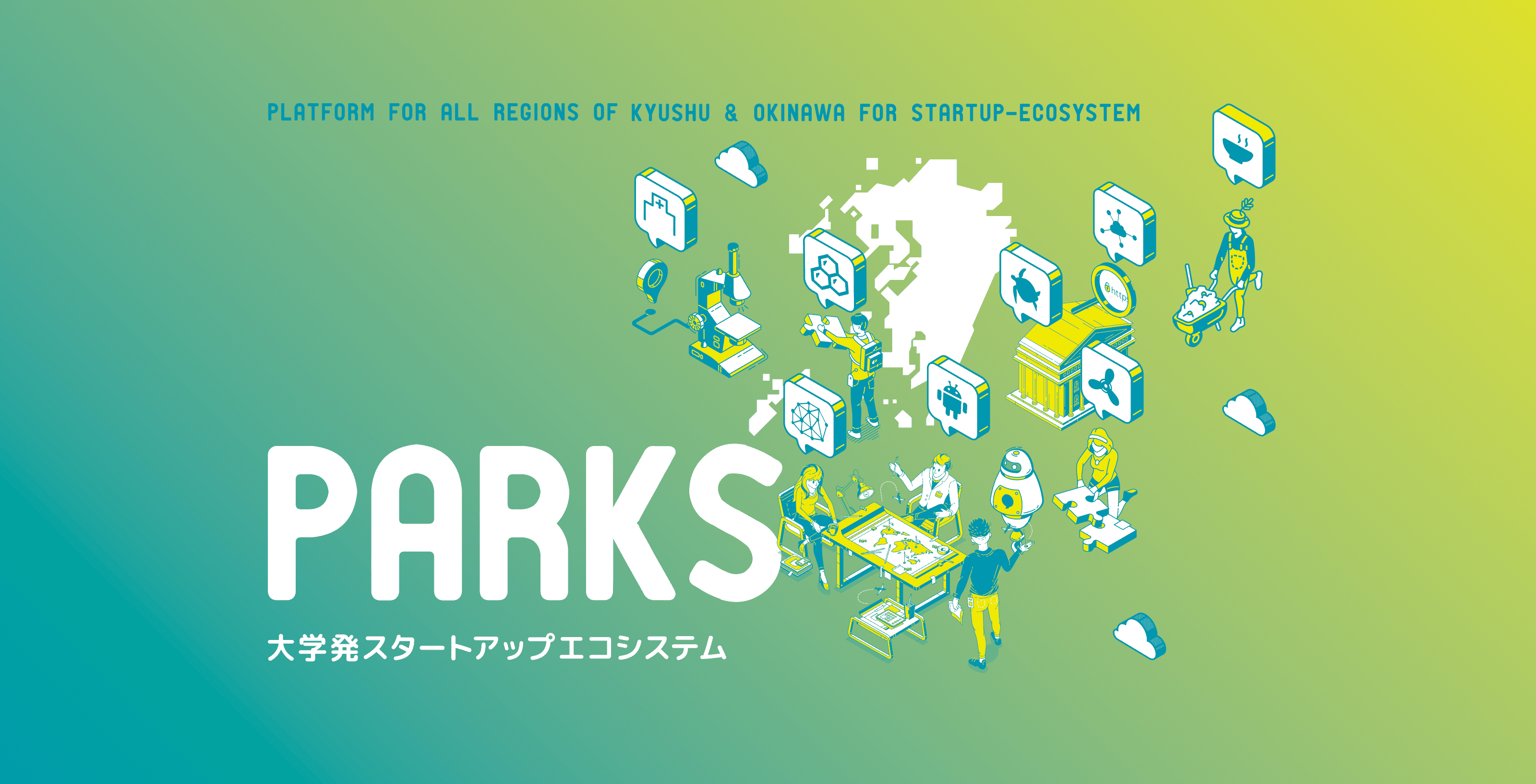アジアへの窓口である九州・沖縄という地域にあるべき、かつ顧客志向で業界改変を実現可能なベンチャーを持続的に創出していくことを目的とし設立されたプラットフォームです。スタートアップ・エコシステム拠点都市に選定されている福岡市、北九州市をモデル都市に、さらに九州・大学発ベンチャー振興会議との密な連携のもと、アントレプレナーシップ教育から起業支援までを一気通貫で実施し、2026 年度末までに、PARKS インターユニバーシティ設立を目指し活動しています。