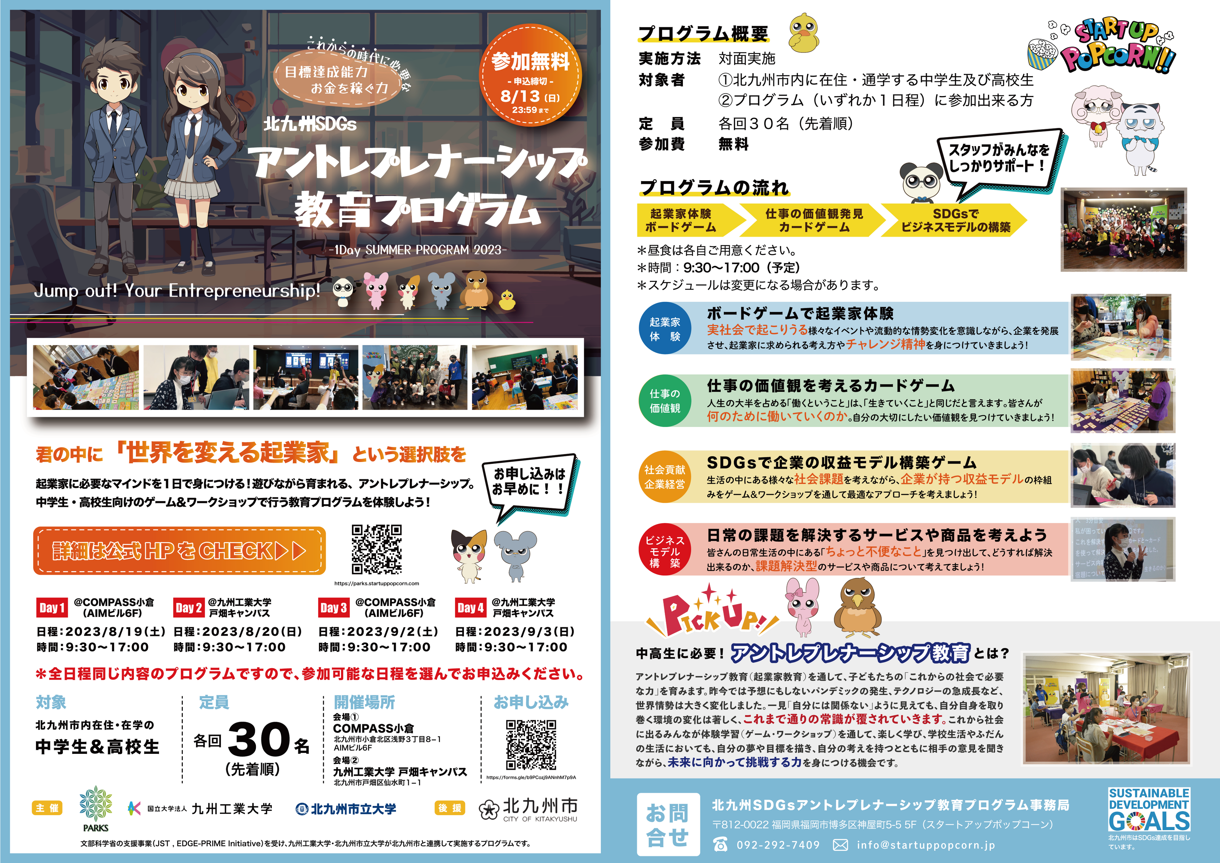 北九州市内に在住・通学する中学生と高校生を対象に、楽しみながら学べるアントレプレナーシップ教育プログラムを以下のとおり開催します。その名も「1Day SUMMER PROGRAM 2023」!