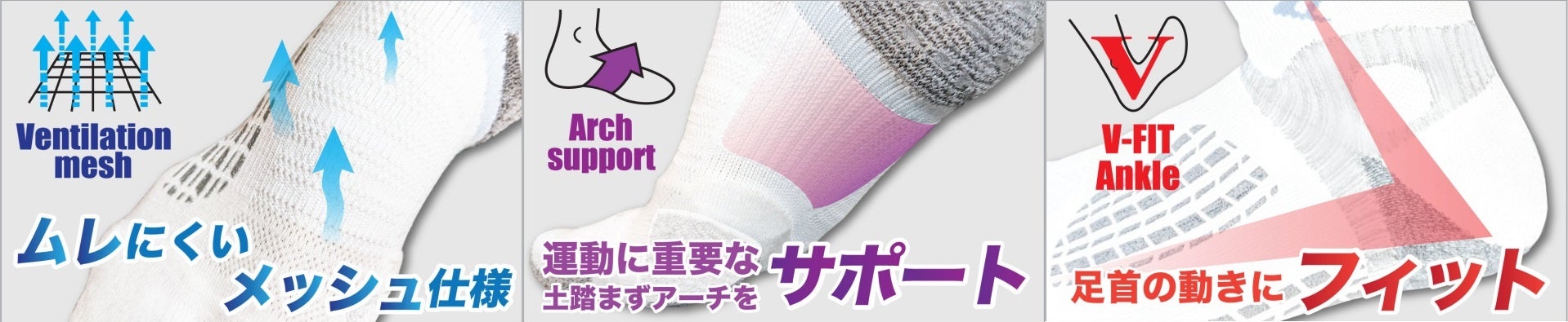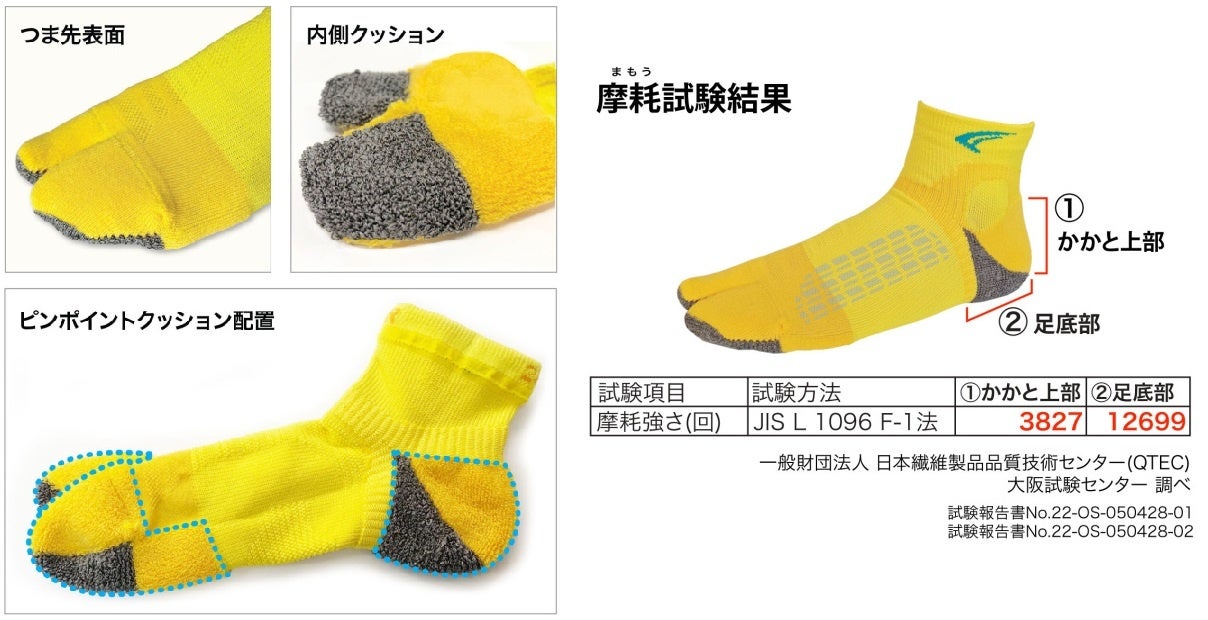 つま先がタビ形状になっているソックスは親指が独立している為、指先に力が入れやすくスィング動作時に踏ん張りが効きやすい特徴があります。また、荷重のかかる母趾球から指先、かかと部分にピンポイントでクッションパイルを配置しました。一方、クッションパイル部以外は薄地に切り替え、必要な部分にメッシュ部を配置することで暑苦しい印象はありません。さらに、擦れて破れやすい部位に特別な補強構造を施しています。大手スポーツメーカーの一般的な摩耗試験基準が1,000回以上と設定されているところ、本製品の摩耗試験結果では、一般的な基準と比較して高い数値の試験結果が実証されています。