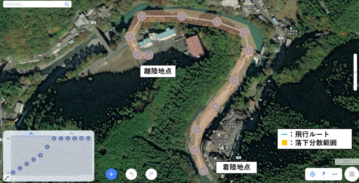 本検証では、CLAS対応GNSS※4受信機を搭載したドローン「ChoronoSky PF2-AE」を使用し、CLAS測位がドローン航路運用における衛星測位誤差低減の有効な手段であるかを評価しました。検証では、秩父市大滝総合支所から道の駅大滝温泉までの河川上空を飛行ルートとして設定し、自動航行を行いました。また、安全性を考慮し、離発着施設付近では高度を徐々に変化させて河川上空航路に侵入することで、有事の際のドローン落下リスク範囲を最小限に抑えるルート設定を行いました。