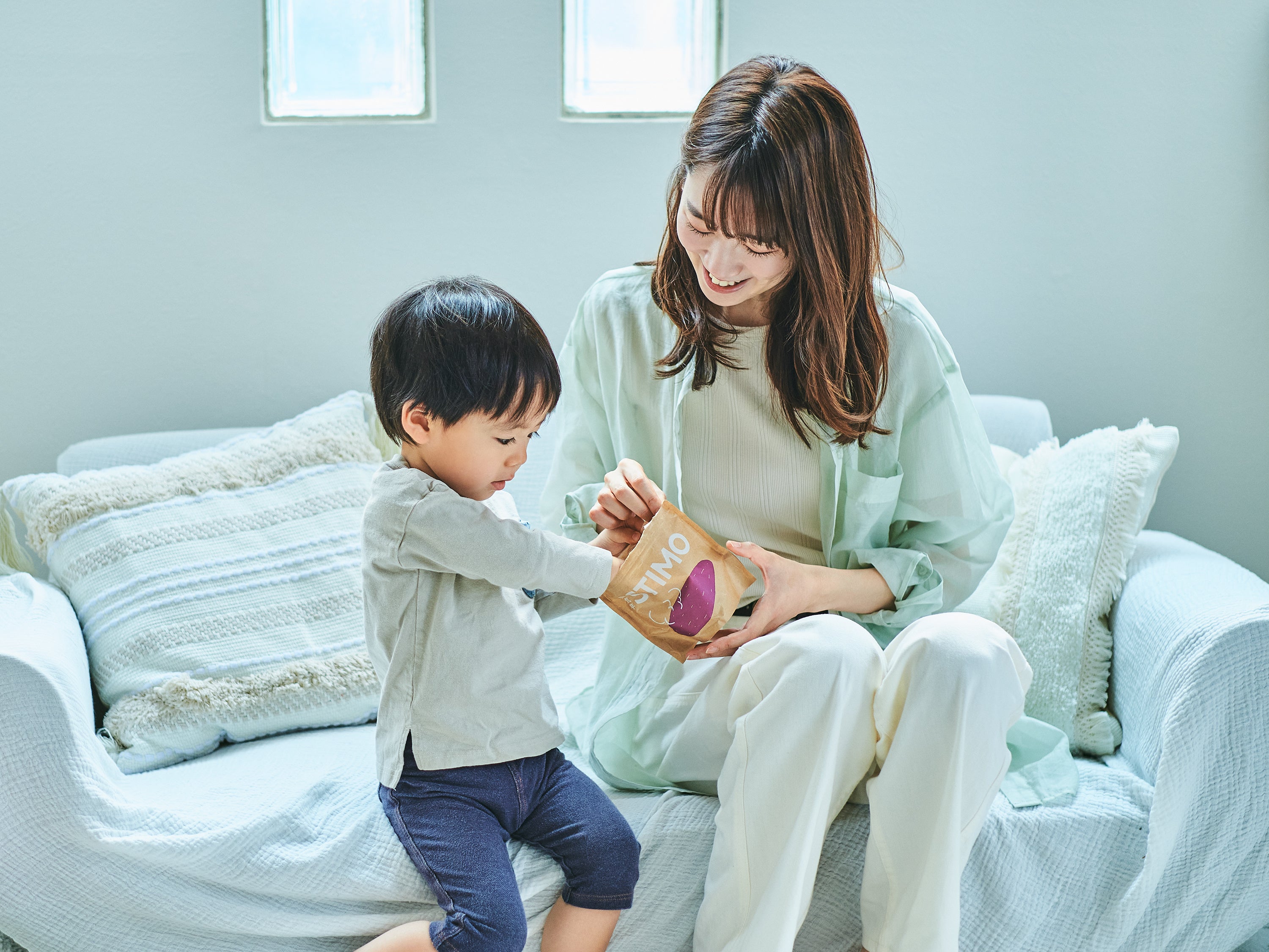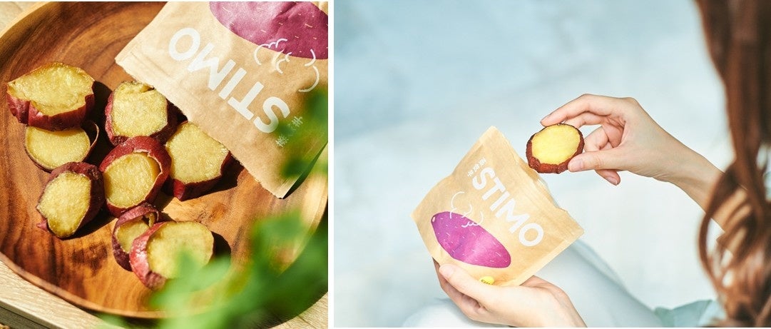 「STIMO」は、焼くのではなく、過熱水蒸気(スチーム)でじっくり火入れを行うことで、おイモの本来の持つ風味や旨味、栄養素を閉じ込め、“しっとりねっとり”食感を楽しめるおイモブランドです。一口サイズにカットすることで食べやすく、ジップ付きのパウチを採用することで、モバイル性に長けた仕様にしました。