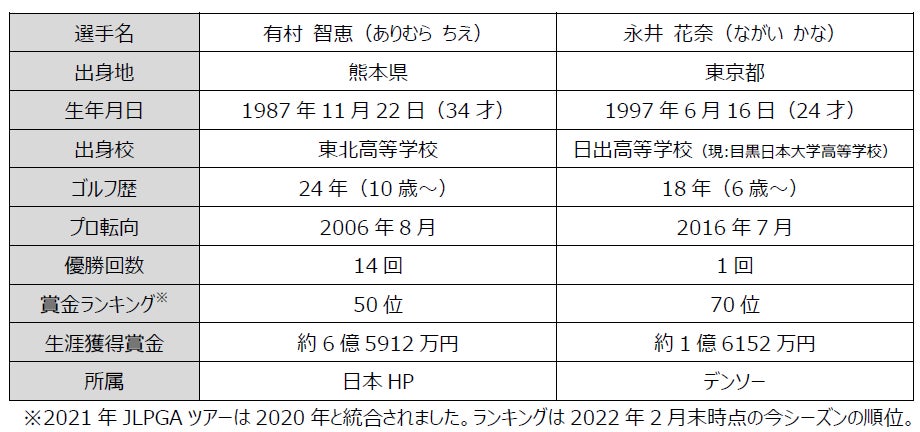 有村選手は、プロ16年目を迎え、米国ツアー出場をはじめとした経験、実績共に豊富な女子プロゴルフ界を代表する選手のひとりです。2021年は賞金総額でランクインを果たし、3年連続でシード権の獲得を果たしました。また、コロナ禍においては女子プロゴルファー有志でSNSのアカウントを立ち上げ、さまざまな企画を通じて女子ゴルフの魅力を発信しています。日本財団選出の「HERO AWARD」受賞に至った「智恵サンタ」も引き続き開催し、積極的な社会貢献活動を継続しています。