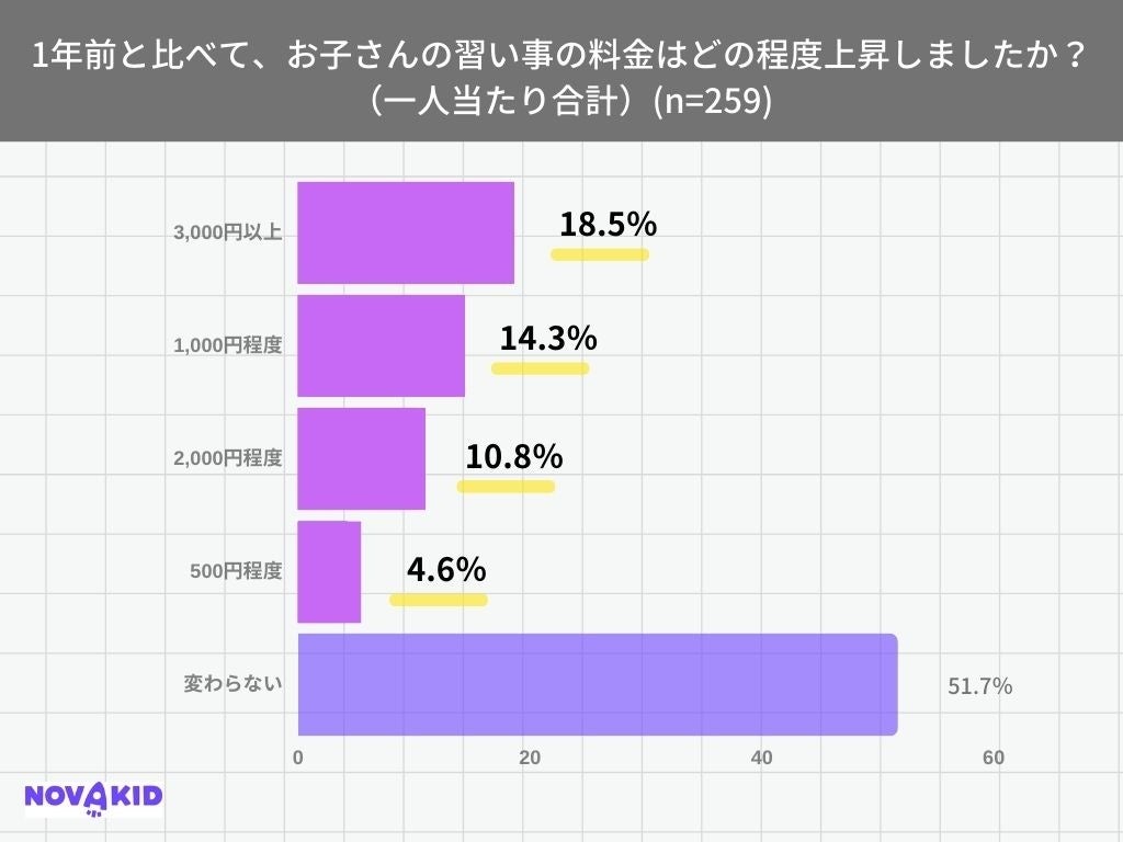「1年前と比べて、お子さんの習い事の料金はどの程度上昇しましたか?(一人当たり合計)」(n=259)という質問に対して、半数の51.7%が「変わらない」と回答、18.5%が「3,000円以上上昇」という回答になりました。全体の約半数が、習い事の費用が上昇したという結果になりました。