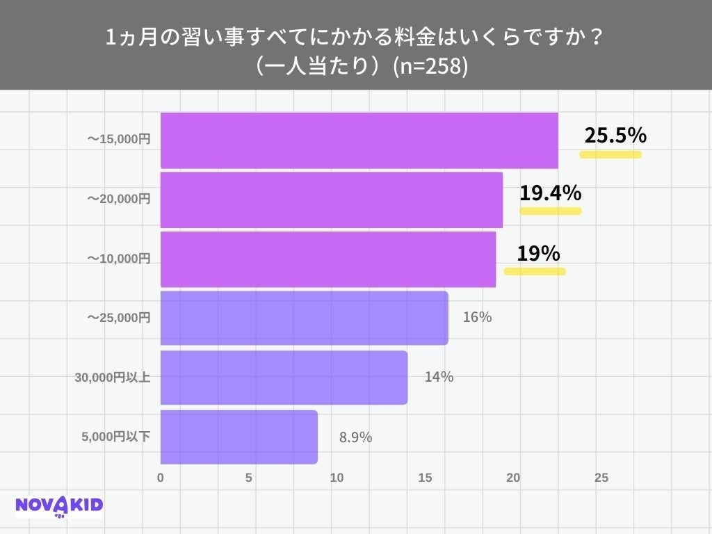 「1ヵ月の習い事すべてにかかる料金はいくらですか?(一人当たり)」(n=258)という質問に対し、「10,000円〜15,000円」が最も多く、25.5%、次いで「15,000円〜20,000円」が19.4%で、ほぼ同数の19%が「5,000〜10,000円」という結果になりました。