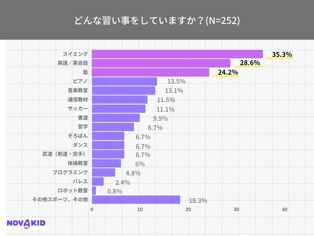 「どんな習い事をしていますか?(複数選択)」(n=252) という質問をしたところ、「スイミング」が最も多く35.3%、ついで「英語/英会話」が28.6%、「塾」が24.2%という結果になりました。