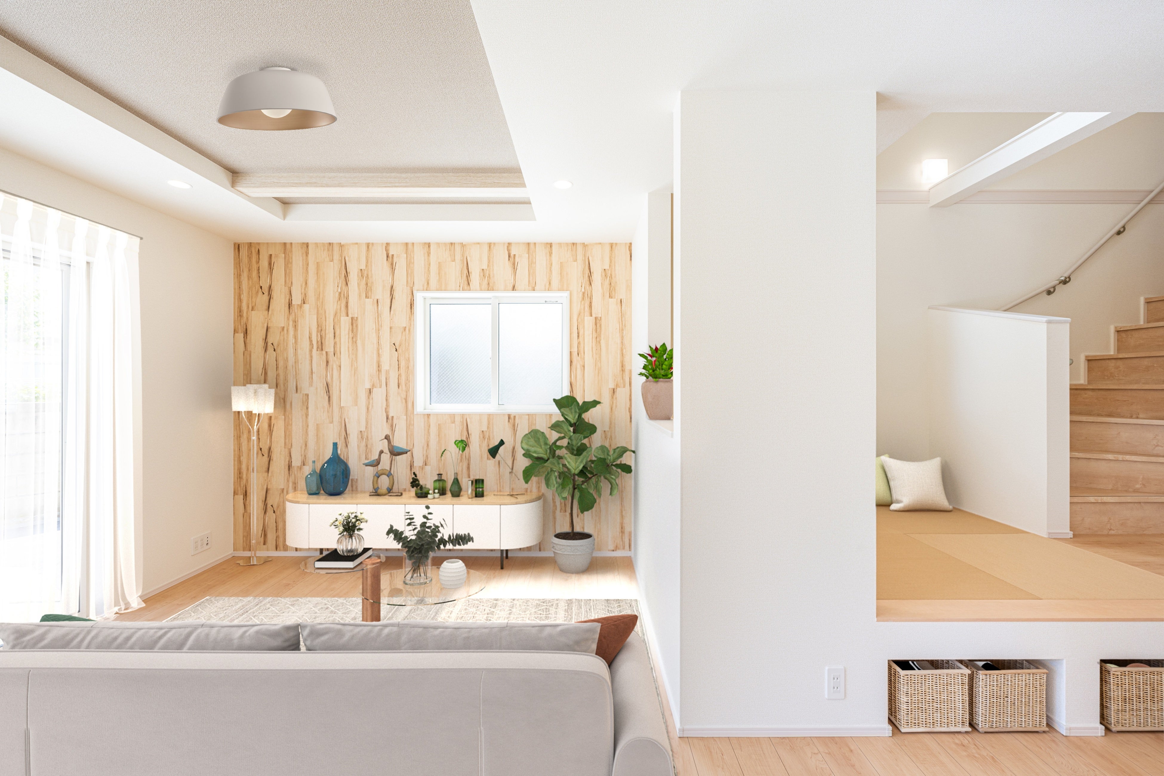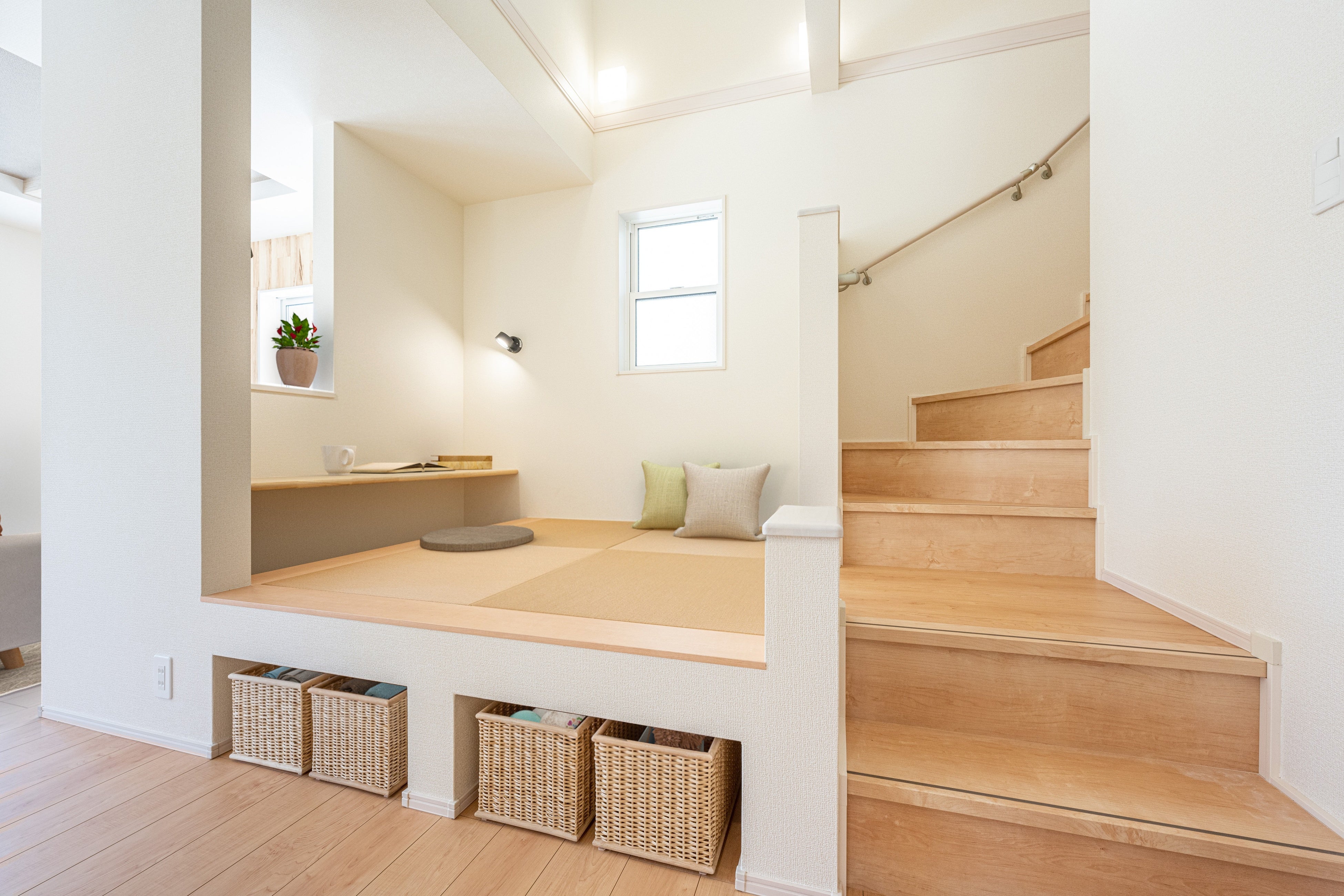 今回のリニューアルでは小上がりの床下に『くり抜き型収納』を追加致しました。マルチスキップわーこ・よーこで使う小物もすっきり収納。吹抜けと小上がりで開放的な空間に、床下も無駄にしない収納スペースで利便性が向上し、より快適な生活へと繋がります。