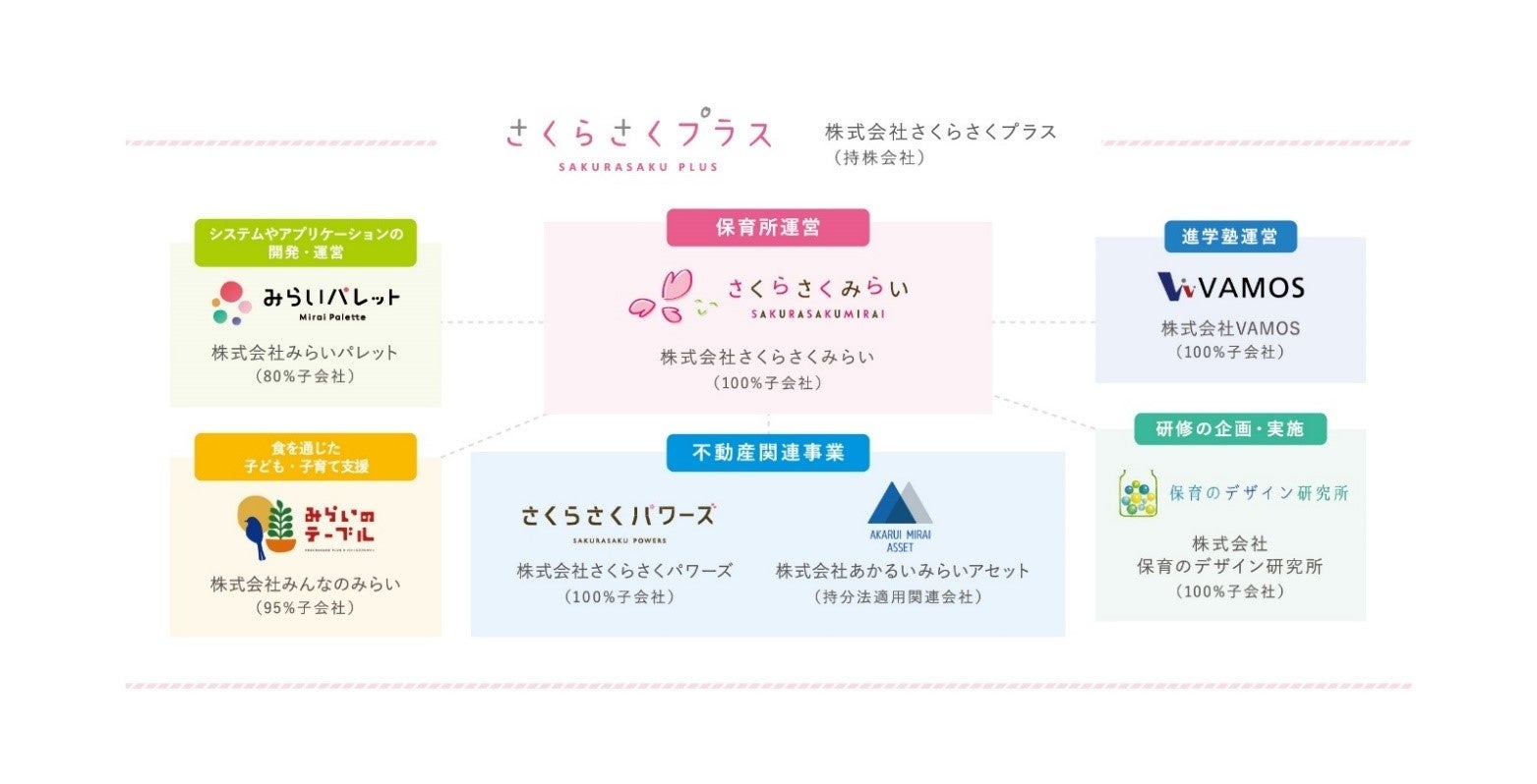 当社グループは、保育所の運営を行う株式会社さくらさくみらいをはじめ、複数の子会社により、子ども・子育て支援に関わる事業を展開しています。東京を中心に展開する保育所『さくらさくみらい』では約4,500人を超えるお子様をお預かりし、子どもたちの健やかな成長をサポートするとともに、保護者の皆様の子育てのパートナーとして共に子どもたちの成長を見守っています。その他、安全安心な住環境を提供する「東京こどもすくすく住宅」の企画・開発や、楽しくおいしく食事ができる子育て支援カフェ『みらいのテーブル』の運営、保育者と保護者がより楽しく保育・子育てができるDXの推進など、子育てを取り巻く様々な環境の整備をしています。