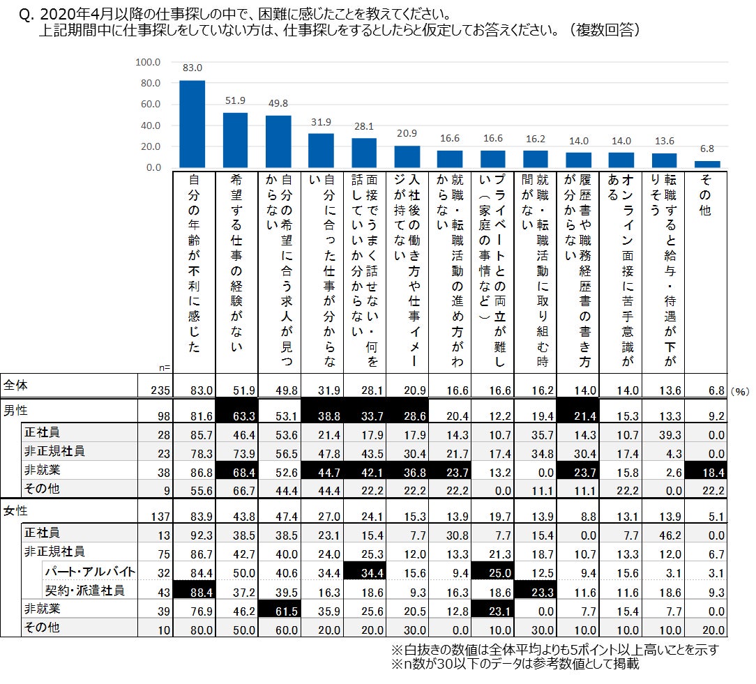 - 仕事探しで困難に感じたことは、「自分の年齢が不利に感じた」83.0%に次いで「希望する仕事の経験がない」51.9%が多かった。「面接でうまく話せない・何を話していいか分からない」28.1%も多く、おおよそ3人に1人は自己分析や自己PRに課題を感じている。