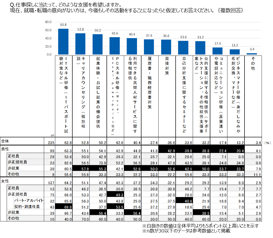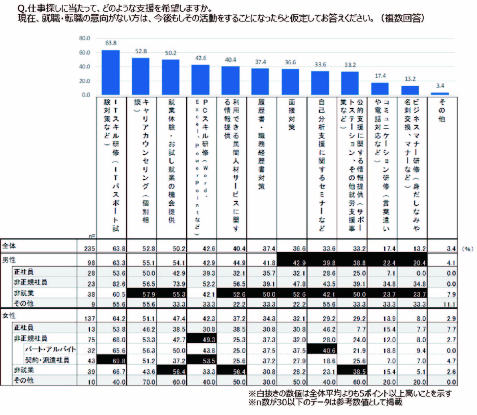 全体と比較すると、男性の非就業者では複数の支援を希望する傾向があり、女性の非正規社員ではPCスキル研修、非就業者では就業体験や情報提供のニーズが目立ち、それぞれの希望に合わせた就労支援の実施が望まれる。