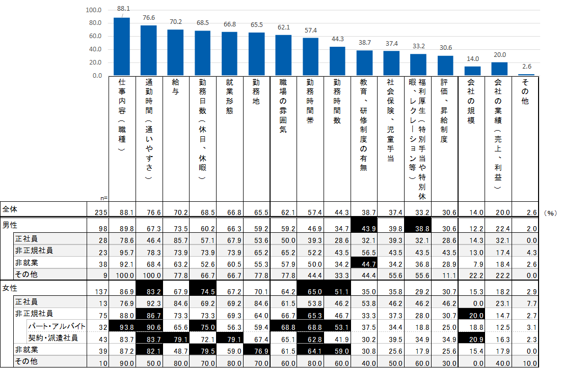 「仕事内容(職種)」88.1%が最も多く、男性の非就業者では90%を超える。参考数値ではあるが、男性の非正規社員でも90%を超えており、仕事探しの中で困難に感じたこととして「希望する仕事の経験がない」が多く挙がっていたことと照らし合わせると、希望する仕事の内容と自分の経験のミスマッチが起こっている可能性が考えられる。全体と比べると、女性は「通勤時間(通いやすさ)」83.2%、「勤務日数(休日、休暇)」74.5%、「勤務時間帯」65.0%、「勤務時間数」51.1%と時間や日数を重視している。