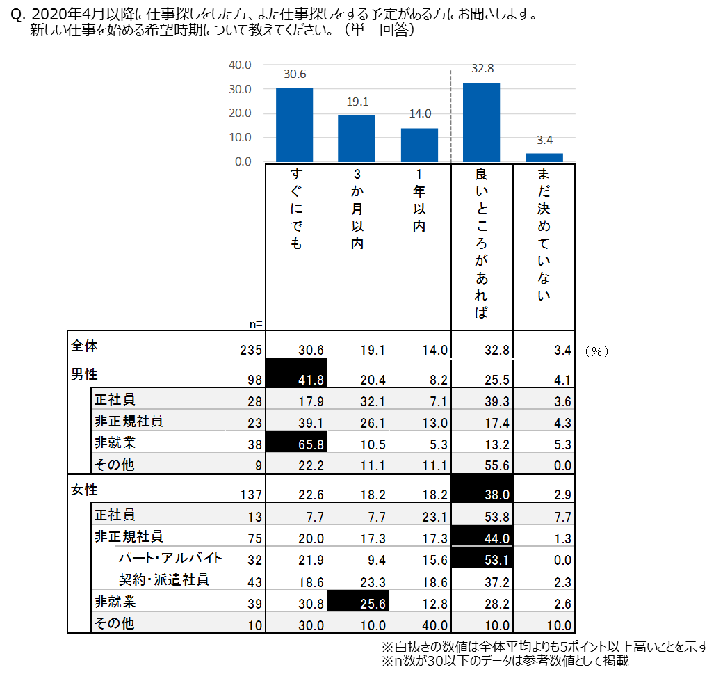 希望の就職・転職時期は「すぐにでも」と「良いところがあれば」がそれぞれ約30%と分かれる結果となった。「すぐにでも」という回答は、男性の非就業者65.8%で多く、早期の就職・転職を希望している。女性の非正規社員では「すぐにでも」が20.0%と、全体と比較すると少なく、時間がかかってもより希望に合う仕事を探す傾向が見られる。