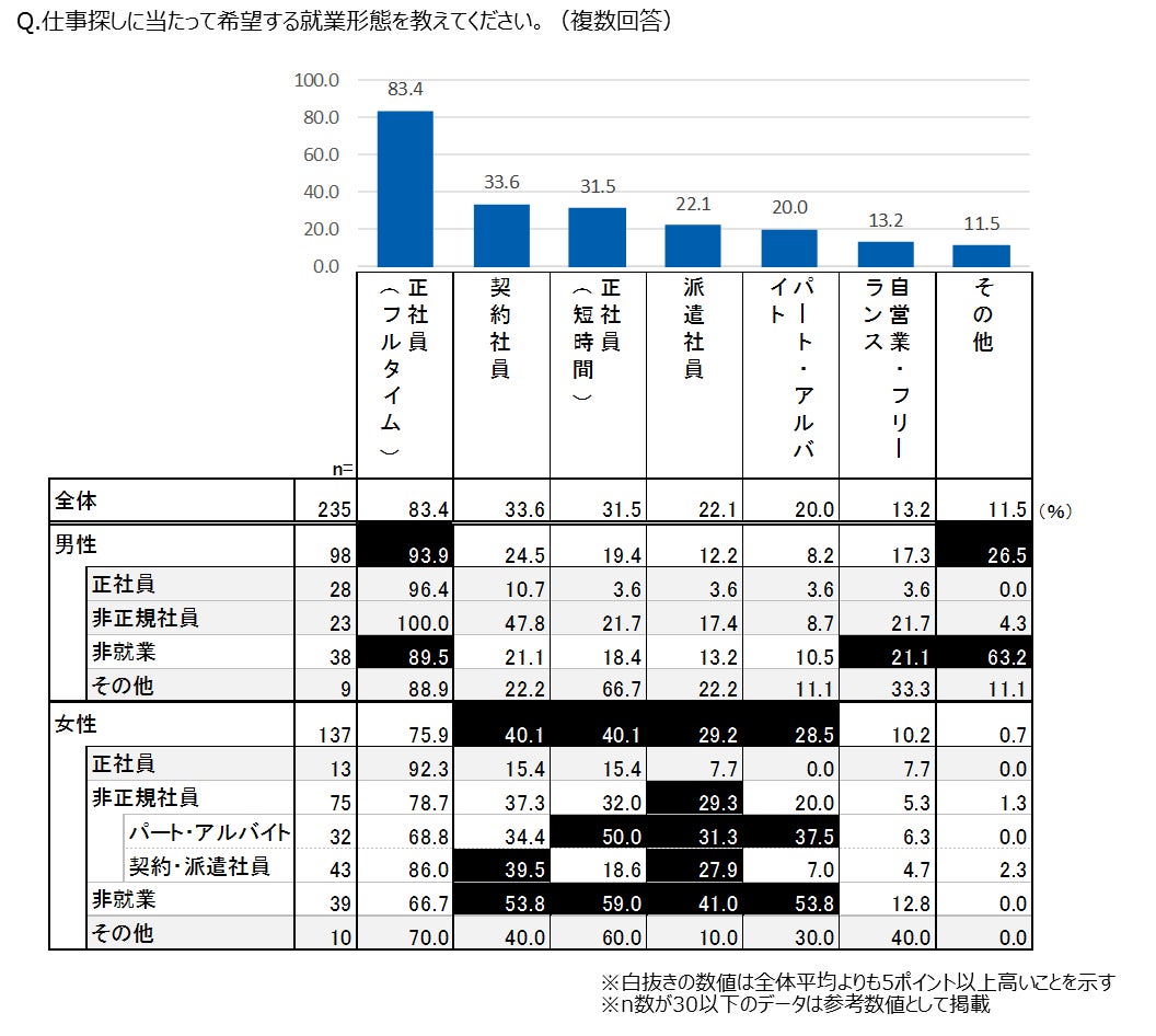 - 回答者が仕事探しを始めた理由は「長く働ける安定した仕事に就きたいから」58.3%が最も多く、希望する就業形態は「正社員(フルタイム)」83.4%が最も多かった。