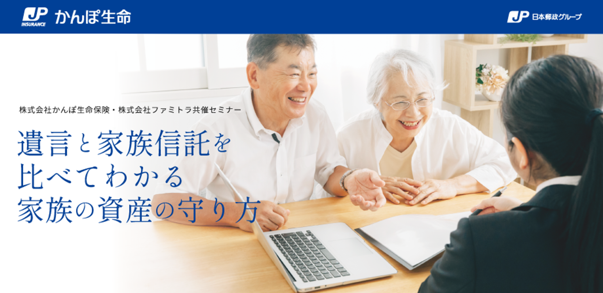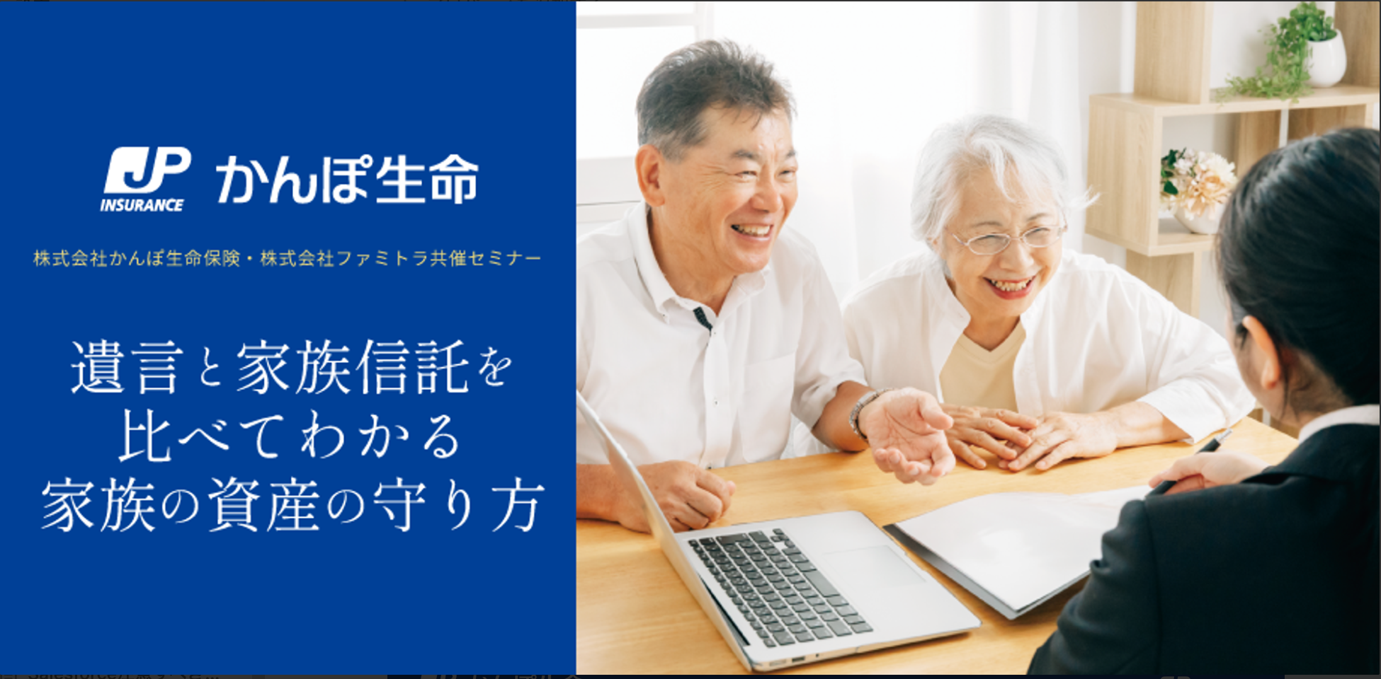 株式会社ファミトラ(東京都港区、代表取締役CEO 三橋克仁)は、提携先の株式会社かんぽ生命と共催で、「遺言と家族信託を比べてわかる家族の資産の守り方」をテーマに2023年4月24日(月)にセミナーを開催します。
