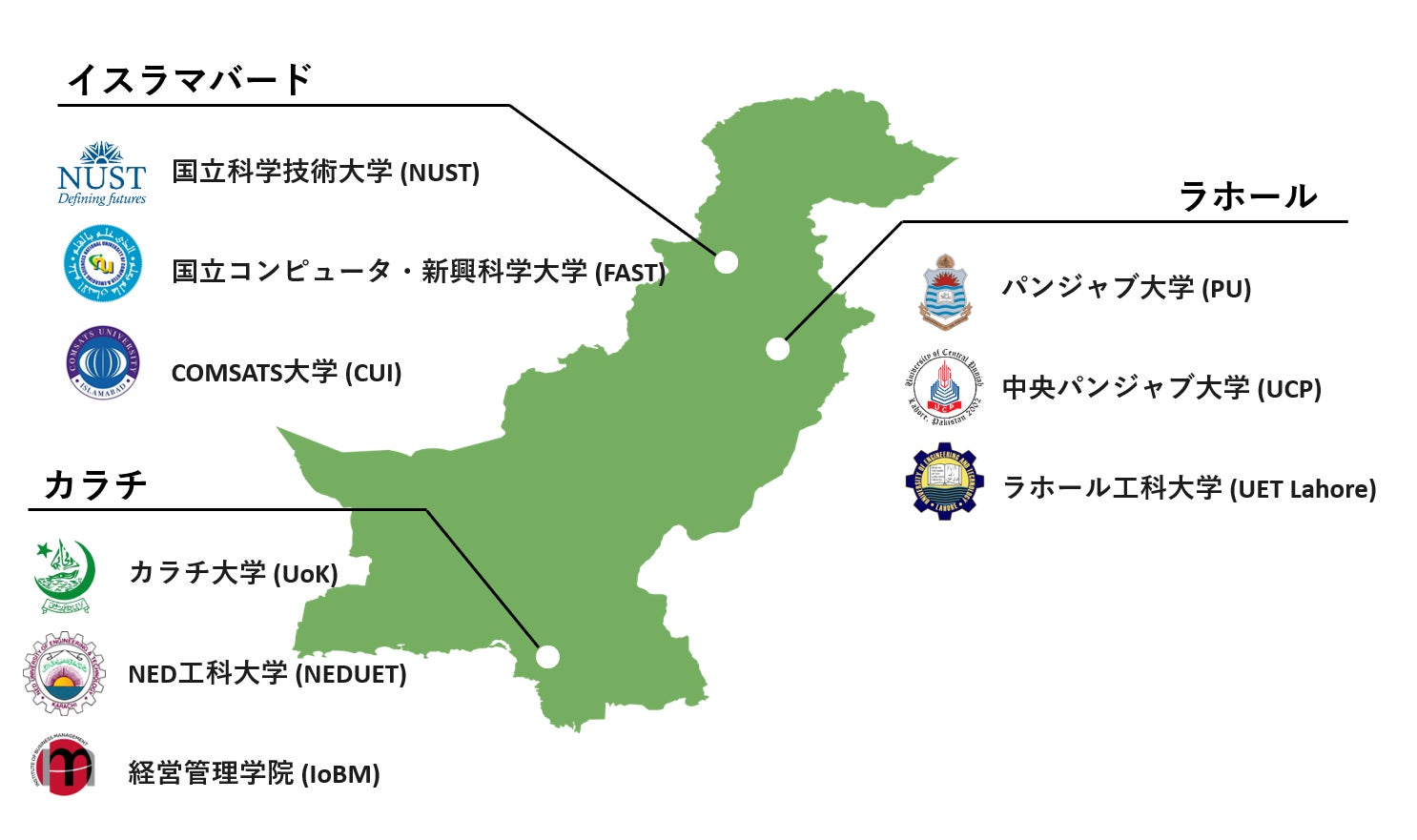 プログラムは「高度I T教育」と「IT開発に特化した日本語教育」の大きく2つに分かれており、パキスタンのイスラマバード・ラホール・カラチの3地域9大学から3年生・4年生合わせて54名を募り、1年間に渡るプログラムを開講します。講義形式は現地及びリモートのハイブリッド型で行い、IT教育が週に1-2回、日本語教育が週に1回行われます。最終的に日本企業で働くことに主眼をおいた当社の講師陣は、海外ITエンジニアのマネジメント経験が豊富な日本人と、日本企業での活躍経験のあるパキスタンITエンジニアで構成されています。また、日本語教育においては、日本語教育に長く携わる当社講師のほか、国際社会貢献センターによる協力も得ながら行われます。
