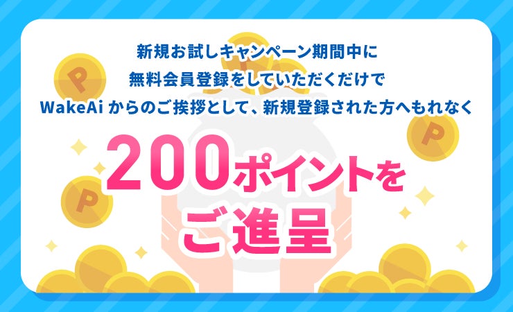新規無料登録された新規ユーザーの方へはもれなくWakeAiで使える200ポイントをプレゼント🎁