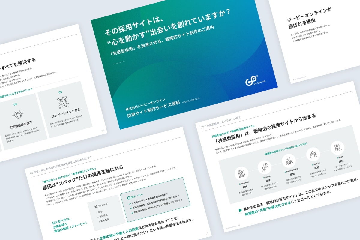 Webサイトの企画・制作を手がける株式会社ジーピーオンライン(本社:大阪府大阪市・東京都新宿区、代表取締役社長:豊永 豊)は、企業の採用課題を解決するためのノウハウをまとめた『採用サイト制作サービス資料』をリニューアルし、本日公開いたしました。