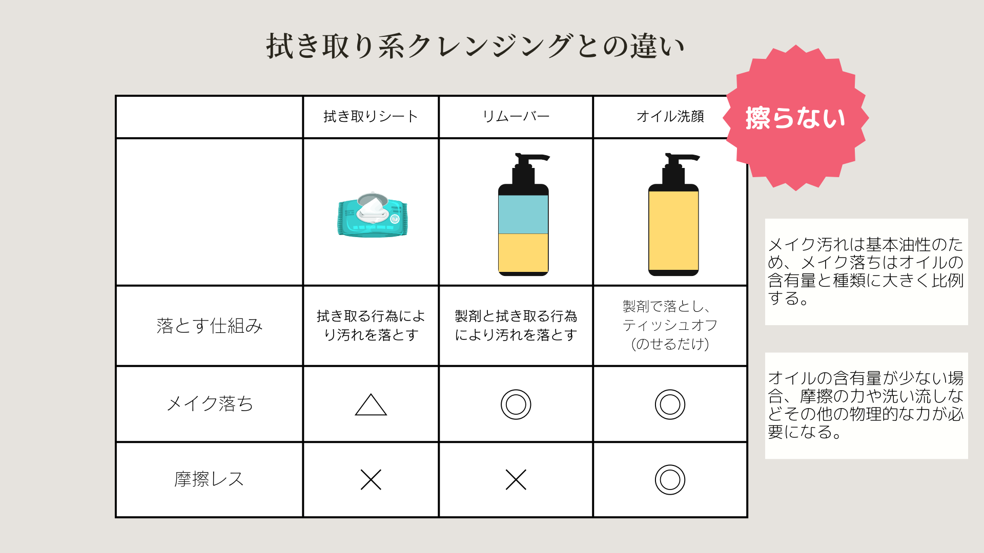 洗い流しの行為がないクレンジングとしてシートクレンジングやリムーバーなどの製品がございます。本製品はティッシュオフによりメイク汚れを除去しますが、製剤のオイルがメイクに馴染むことにより、摩擦レスで