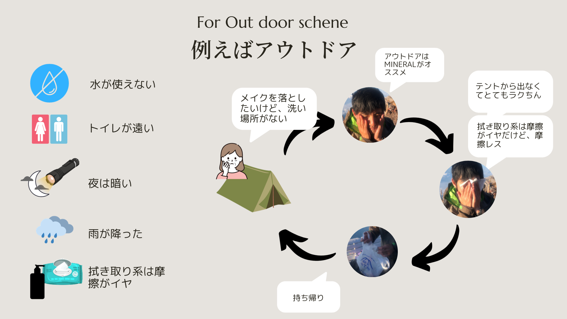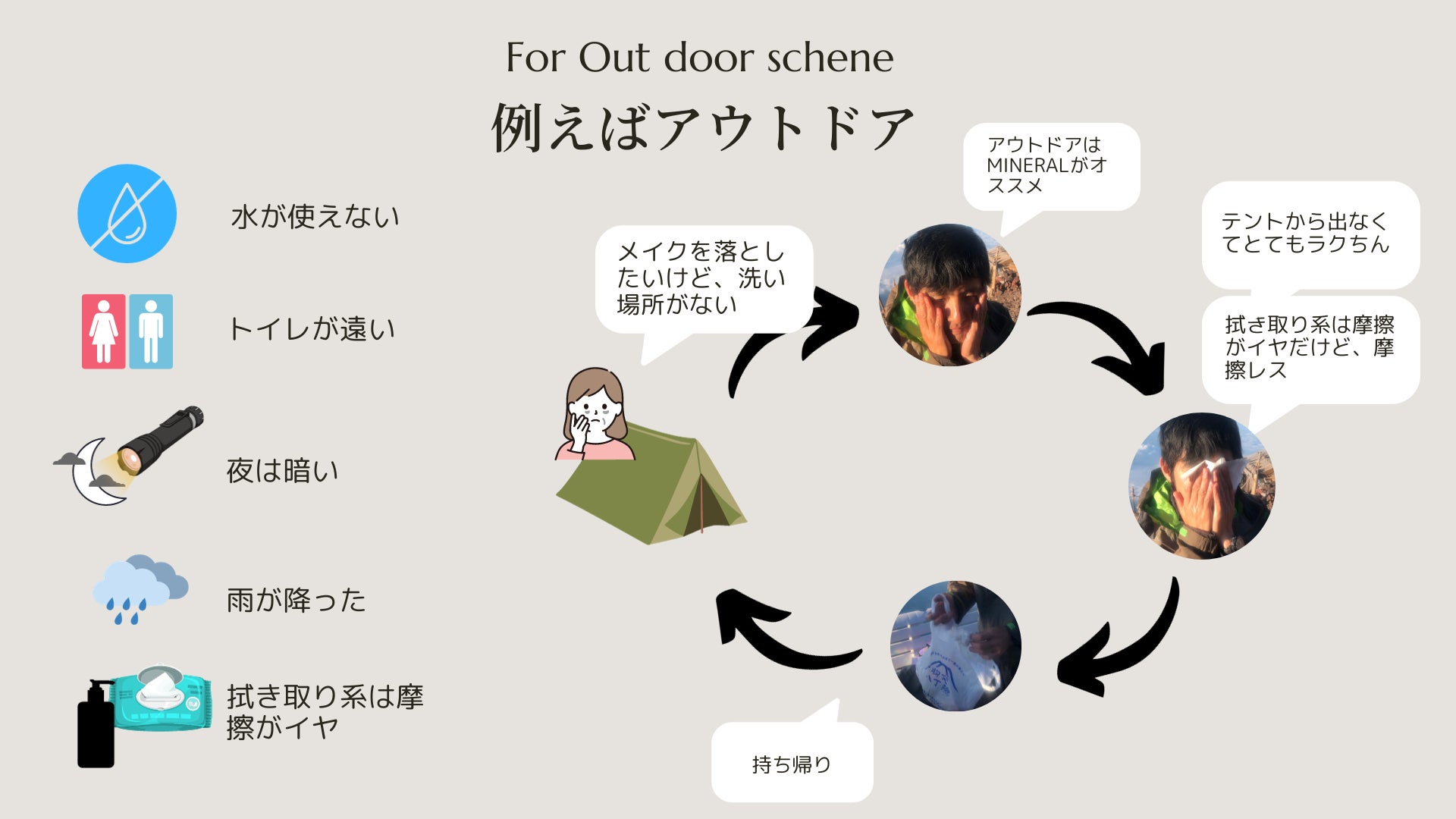 本製品はこの洗いすぎという現代の美容習慣に着目し、オイルのみでメイクや汚れを落とし、洗い流すという行為がなく、ティッシュオフによりメイク汚れや皮脂の汚れを落とすという使用するだけで生活の中で洗う行為による肌への負担が1回減り、保湿まで完了してしまうというこれまでになかった画期的な商品となっています。本製品は、水を使わず洗う行為がないため、様々な環境でのメイク落としや洗顔の市場開拓ができると考えております。その中のひとつがアウトドア、登山、避難場所などでの使用シーンです。