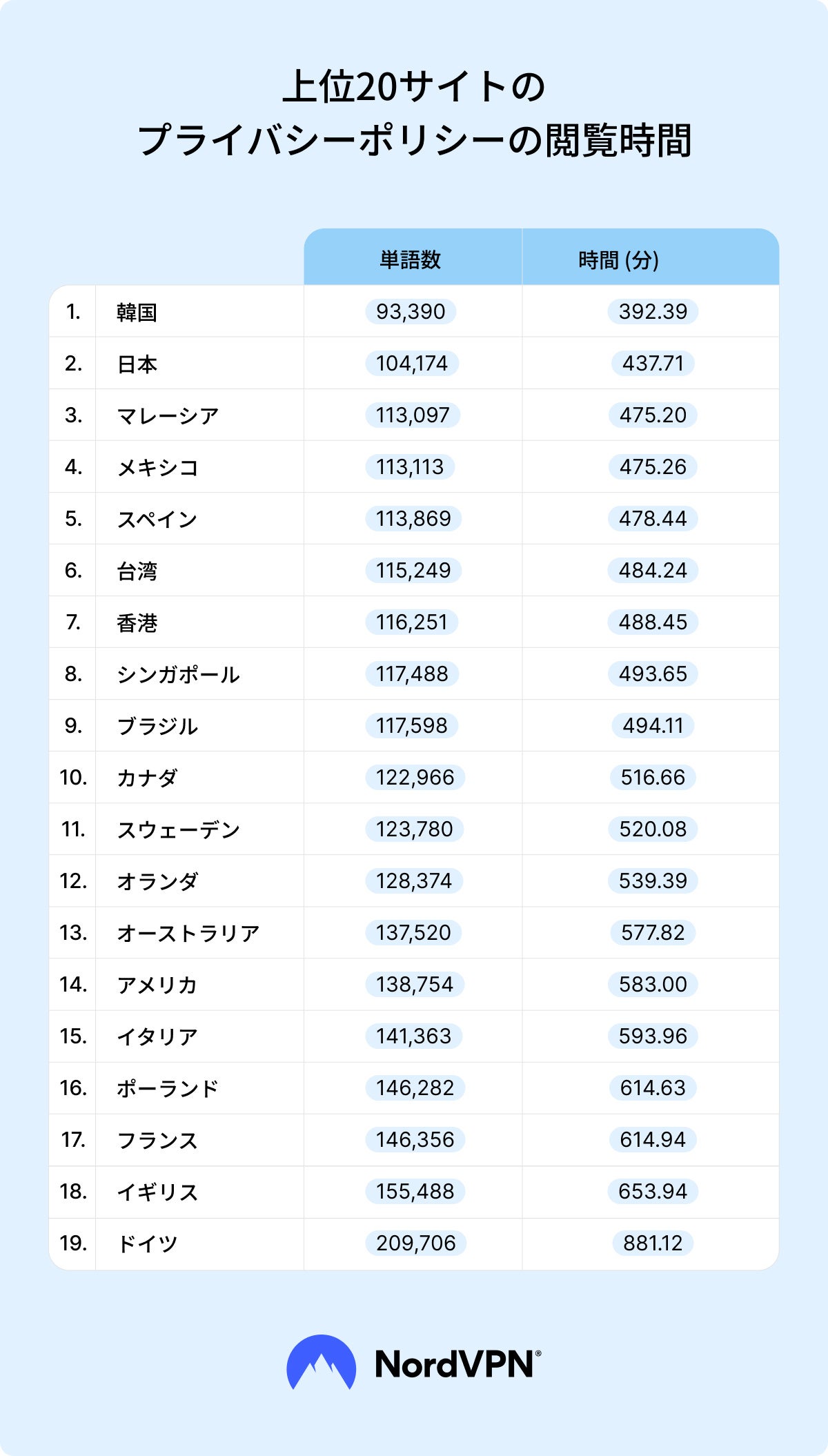 プライバシーポリシーの読了時間は、プライバシーポリシーの文字数を数え、FRESテストおよびコールマン・リアウテストを用いて各プライバシーポリシーの読みやすさを評価することで計算されました。これらのテストの仕組みについての詳細はこちら [https://nordvpn.com/ja/blog/privacypolicy-survey-japan/]をご覧ください。
