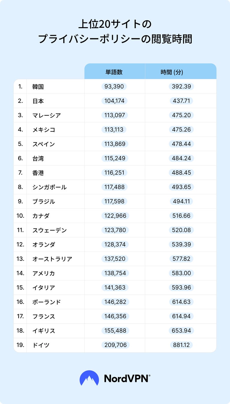 サイバーセキュリティ企業NordVPNは、世界19か国で最も人気のある20サイトを調査し、それぞれのプライバシーポリシーを読むために必要な時間を確認しました。