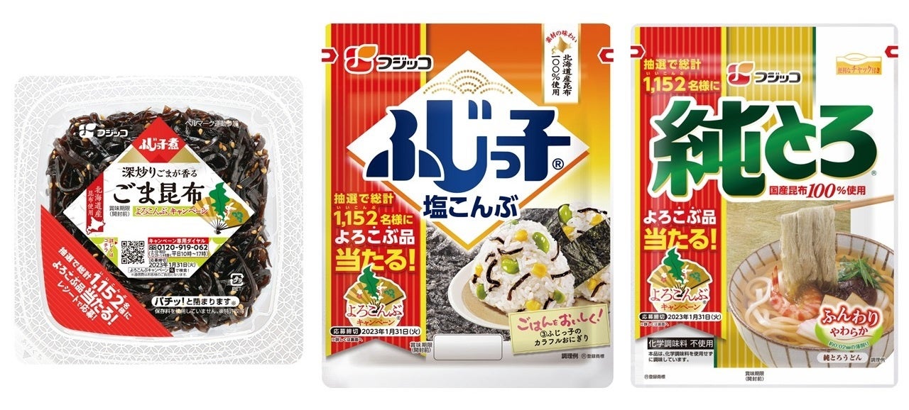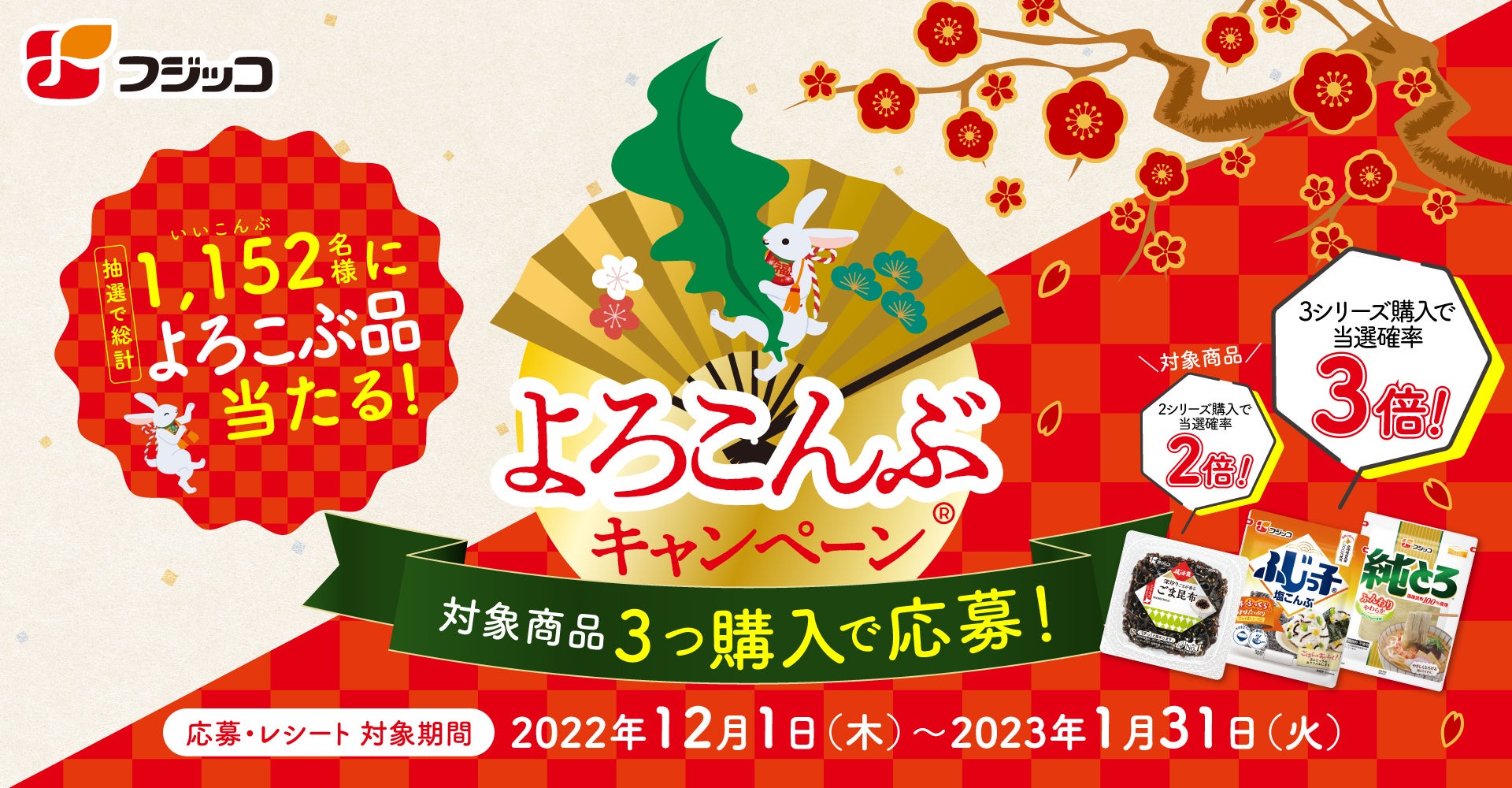 フジッコ株式会社(本社:神戸市中央区/代表取締役社長執行役員:福井正一)は、「ふじっ子煮」「ふじっ子(塩こんぶ)」「純とろ」各シリーズをご購入されたお客様を対象に、2022 年 12 月 1 日(木)から 2023 年 1 月31 日(火)までの間、『よろこんぶ®キャンペーン』を実施します。