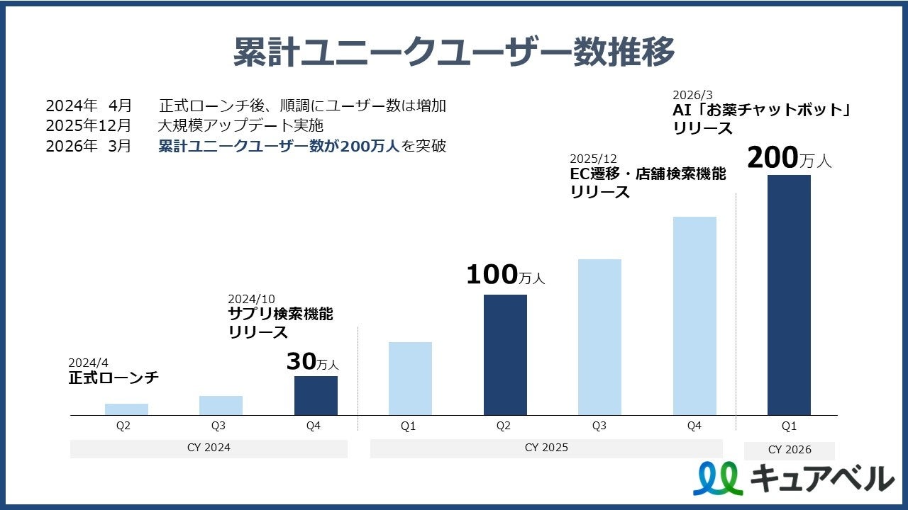 こうした基盤の上に、2025年12月の商品比較機能・店舗検索機能の追加、そして2026年3月のAI「お薬相談チャットボット」のリリースという二度の大型アップデートが成長を大きく加速させました。これらの機能拡充により、比較・検討から購入までをワンストップで完結できるサービスへと進化したことで、累計ユーザー数200万人の突破を実現いたしました。