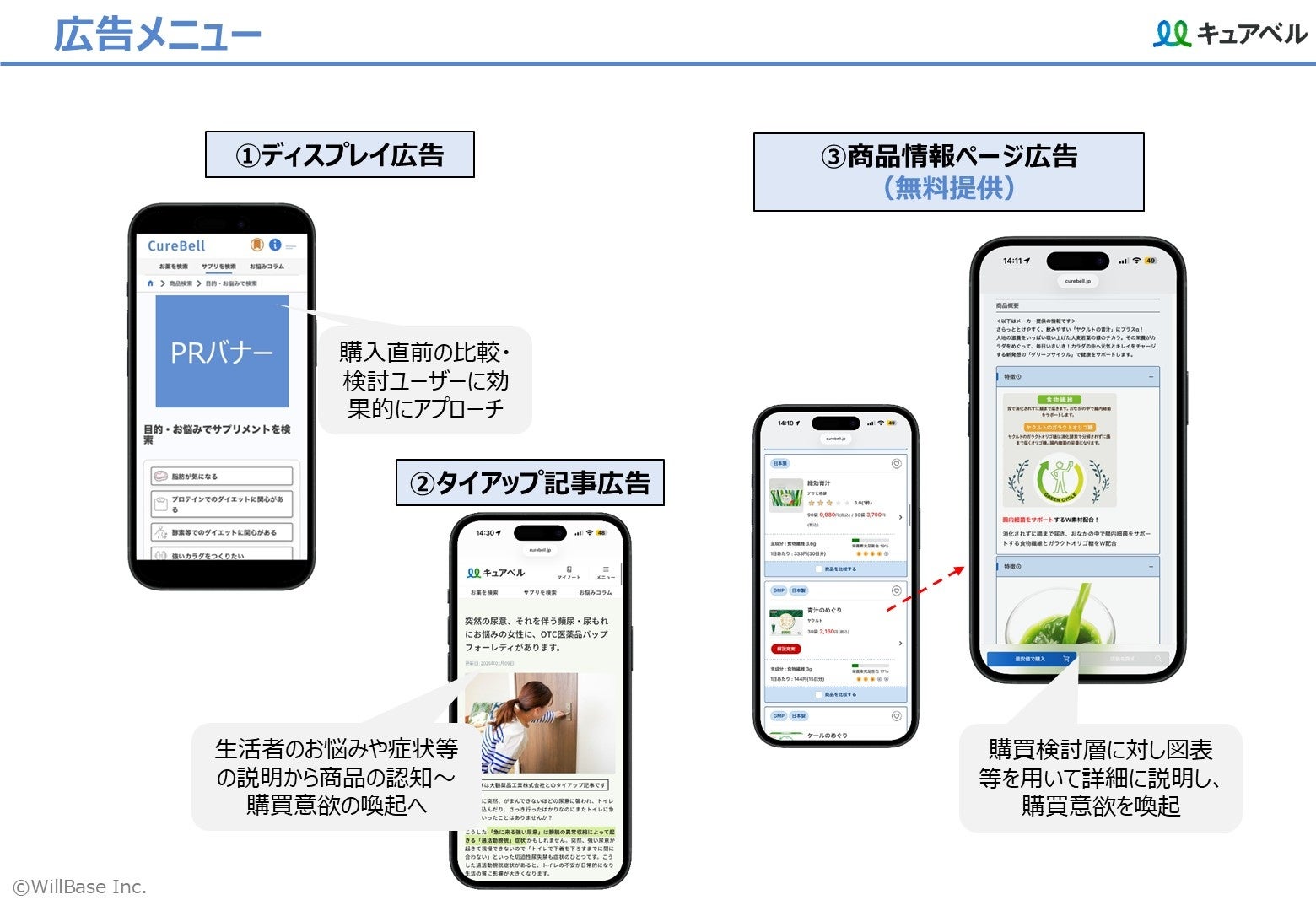 ヘルスケア関連メーカー様に対し、キュアベルの購買意欲の高いユーザー層へアプローチできる広告・マーケティング支援メニューを拡充し、商品認知から購買、ファン化までを一気通貫で支援するソリューションを提供します。