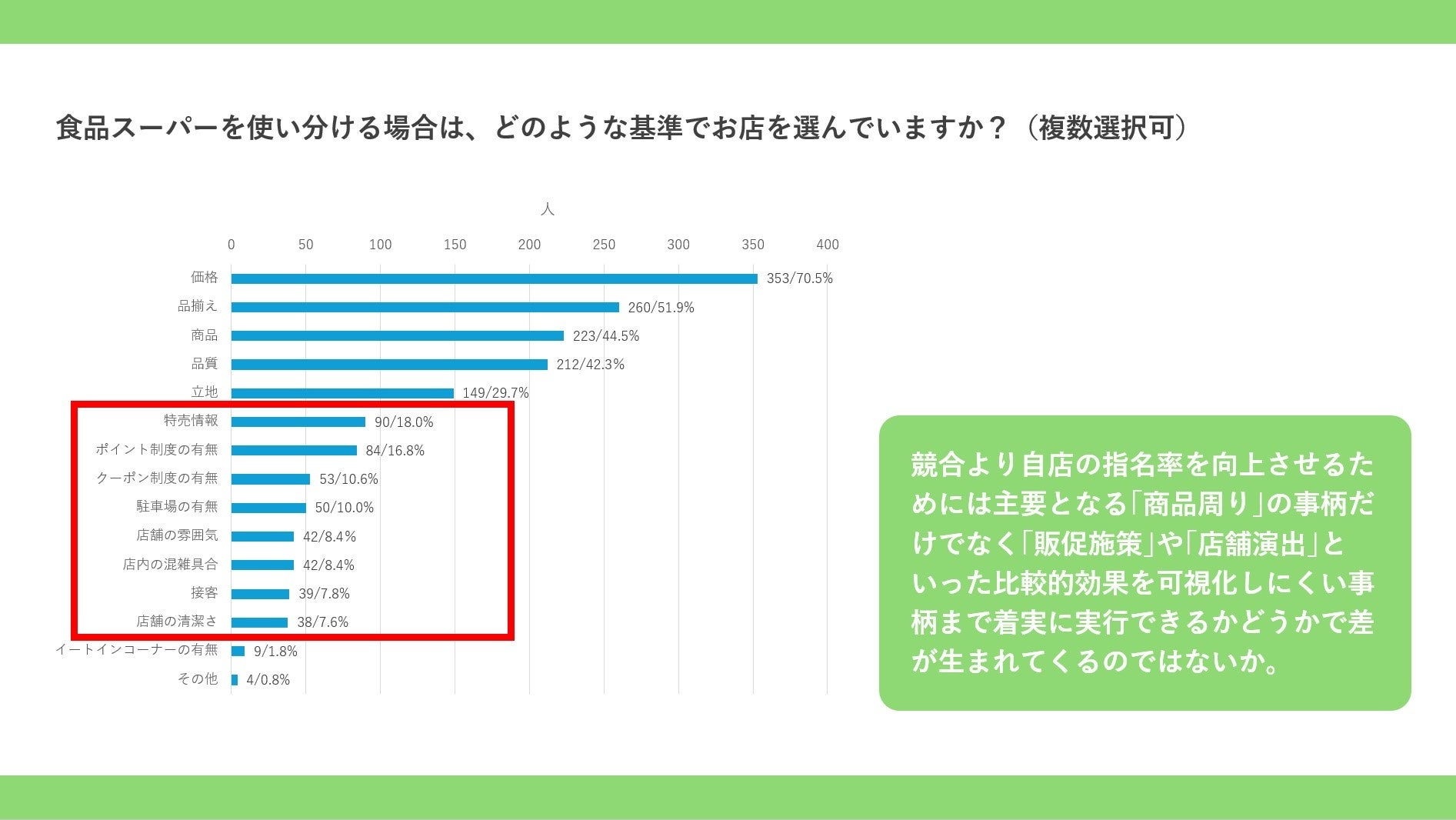 商品の価格、品質、品揃えといった商品周りへの注力も大切だが、さらにお客さまからの指名を獲得するために、「販促施策」や「店舗演出」といった効果を可視化しにくい活動についても、着実かつ、幅広く実行していくことで、お客さまの「来店理由」や「買う理由」を増やすことにもつながっていくのではないか。