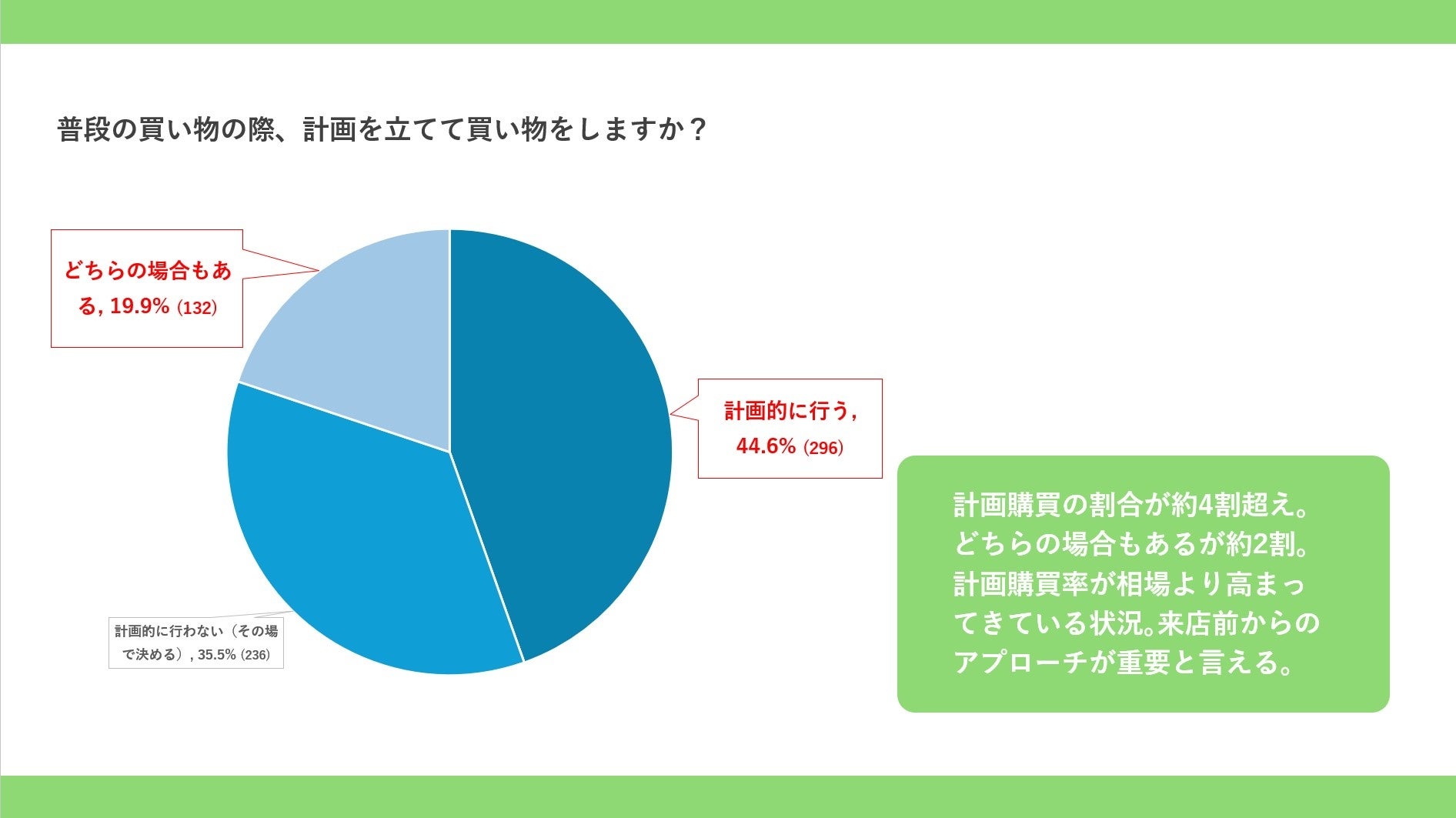 反対に「その場で決める」の35.5% +「どちらの場合もある」の19.9%に着目すると、この非計画購買といった浮遊層にいかにアピールできるか、そういった点も売上アップには不可欠な課題でもある。