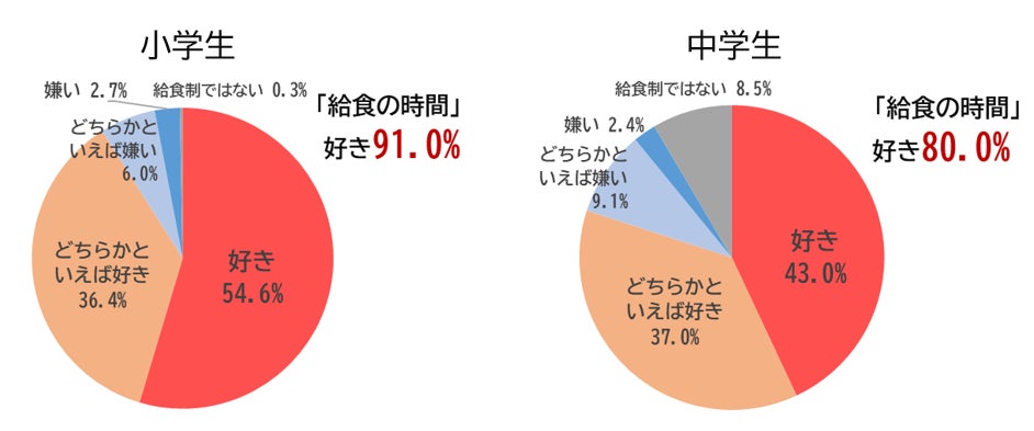 小・中学生別に見ると、小学生の「給食の時間が好き(好き/どちらかといえば好き)」という回答が91.0%となり、中学生の80.0%を11.0pt上回った。はっきりと「好き」と回答した割合は、小学生(54.6%)が中学生(43.0%)を11.6pt上回った。