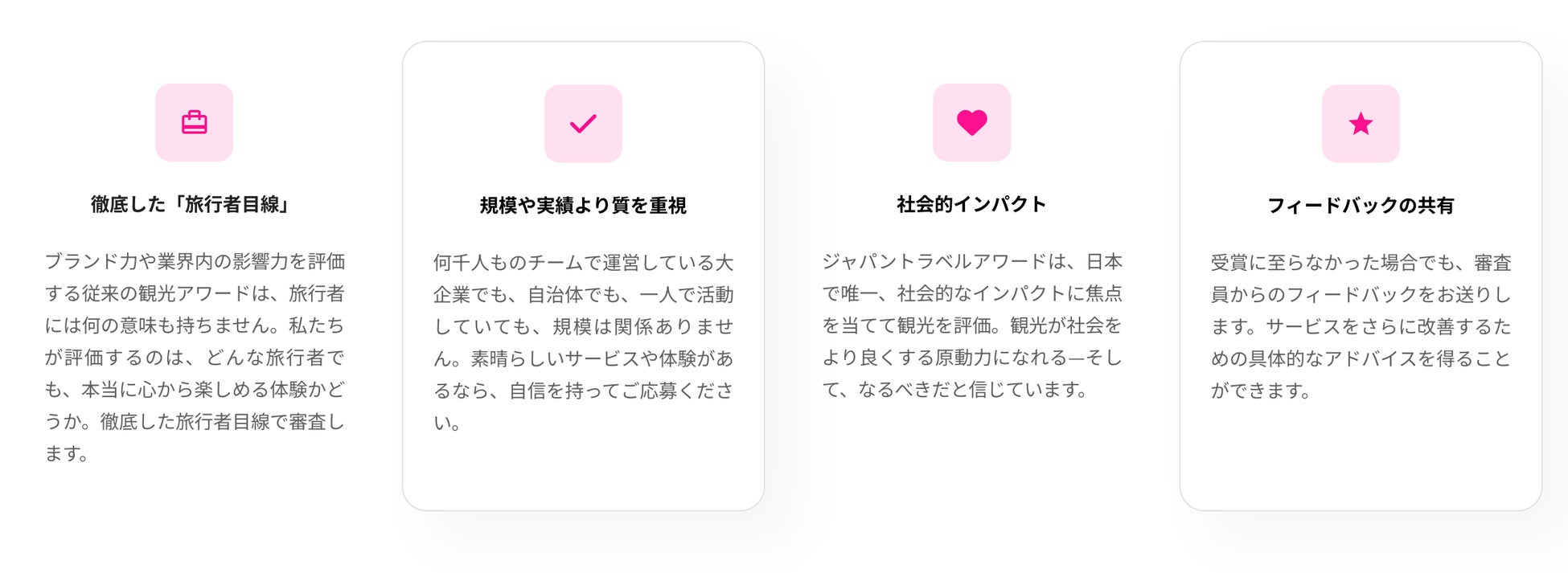 本アワードでは、企業の規模や資金力に関係なく、「誰かの旅をより良くしよう」と真剣に向き合っている取り組みを、世界基準の視点でフェアに審査し表彰します。ジャパントラベルアワードを通して、より良い観光や社会を皆さんと一緒につくっていけることを願っています。